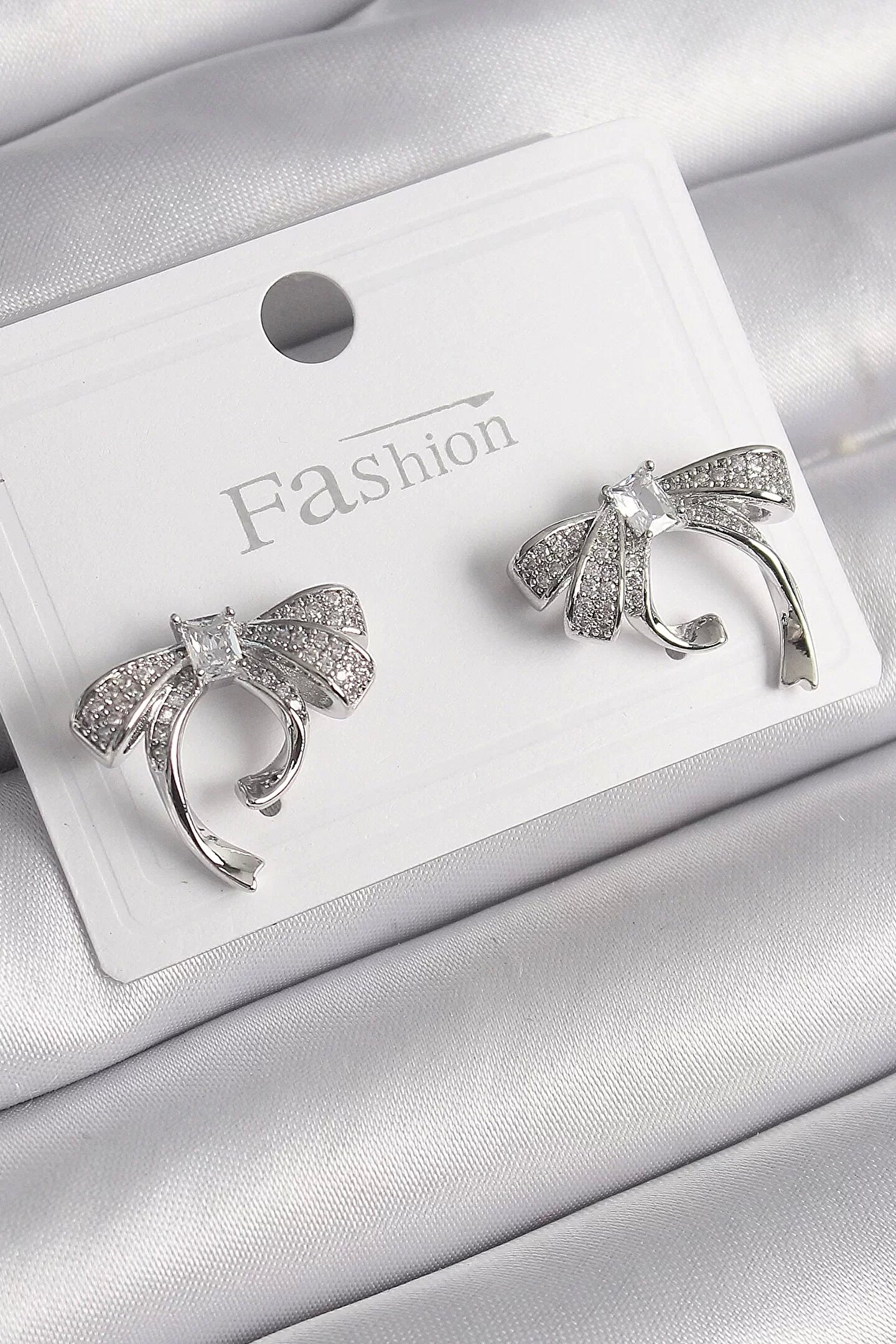 Bellamods Pirinç Gümüş Renk Zirkon Taşlı Fiyonk Model Kadın Küpe