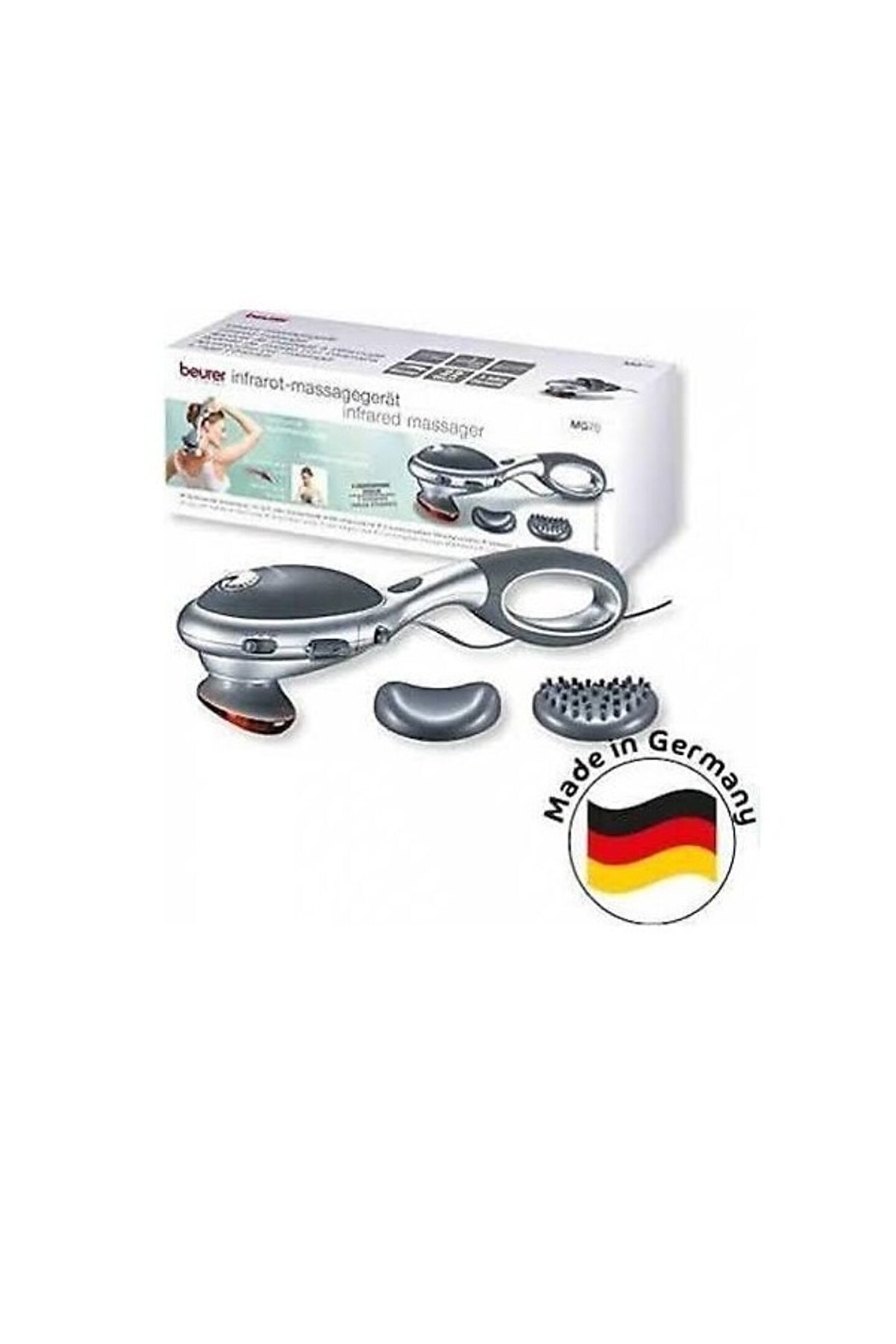 Beurer mg 70 kızılötesi masaj cihazı | sırt, boyun ve bacaklar için mükemmel elektrikli masaj aleti | rahatlatıcı ve derin etkili dokunma masajı evde esenlik - Kendinizi evinizde bir masaj salonuna yakışır bir rahatlama duygusuyla şımartın ; Mg 70'imiz kasları gevşetmeye, gerginliği azaltmaya ve dolaşımı iyileştirmeye yardımcı olur ; Kızılötesi ışık - Kızılötesi ışığın ısısı, masajın etkisini artırır ve ayrıca kan dolaşımını uyararak lokalize gerginlik veya sertliğin giderilmesine yardımcı olur. ; Dokunma masajı – ritmik ve yoğun hareketlerle bu masaj türü kasları yoğun bir spor seansı için hazırlar ve sonrasında gevşemelerine yardımcı olur. ; Çok yönlü - Yoğunluk ayarlanabilir ve masajı isteklerinize göre uyarlamanıza izin verir ; Sap çıkarılabilir ve masaj aleti 2 uçla birlikte gelir: Yumuşak uç ve çivili uç ; Uygulama alanları - Masaj cihazı sırtta, omurga boyunca ve bacaklarda kullanılabilir. Servikal masajın yanı sıra alt bacak masajı için mükemmel ; ;