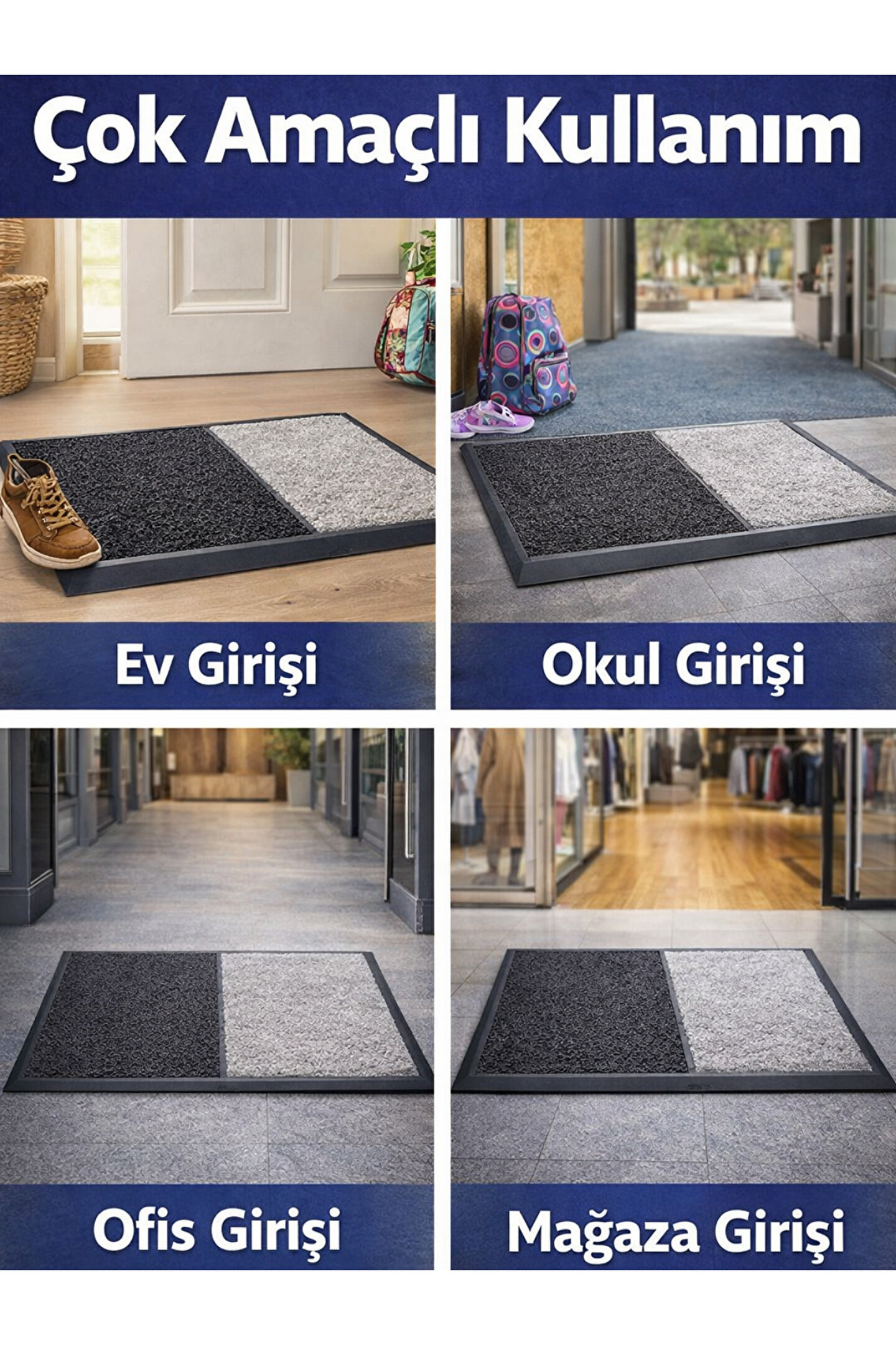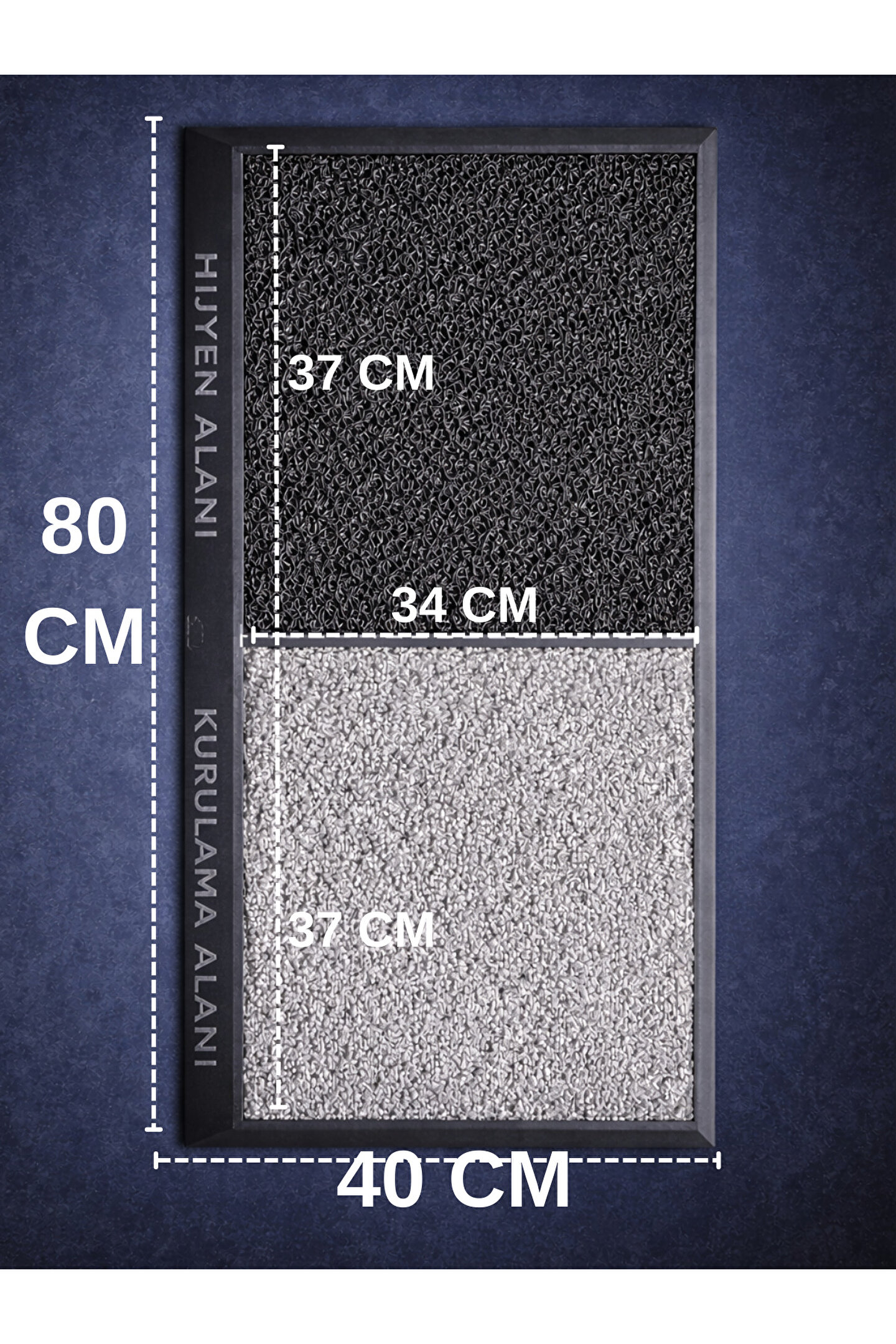 Çift Taraflı Hijyen Paspası, iç mekânlara girerken ayakkabı tabanındaki kir, toz ve nemi etkili şekilde temizlemek ve kurutmak amacıyla özel olarak tasarlanmıştır. İki farklı yüzeyden oluşan yapısı sayesinde tek üründe hem hijyen hem de kuruluk sağlar. Ev, okul, ofis, mağaza ve tüm işyeri girişleri için ideal bir çözümdür.