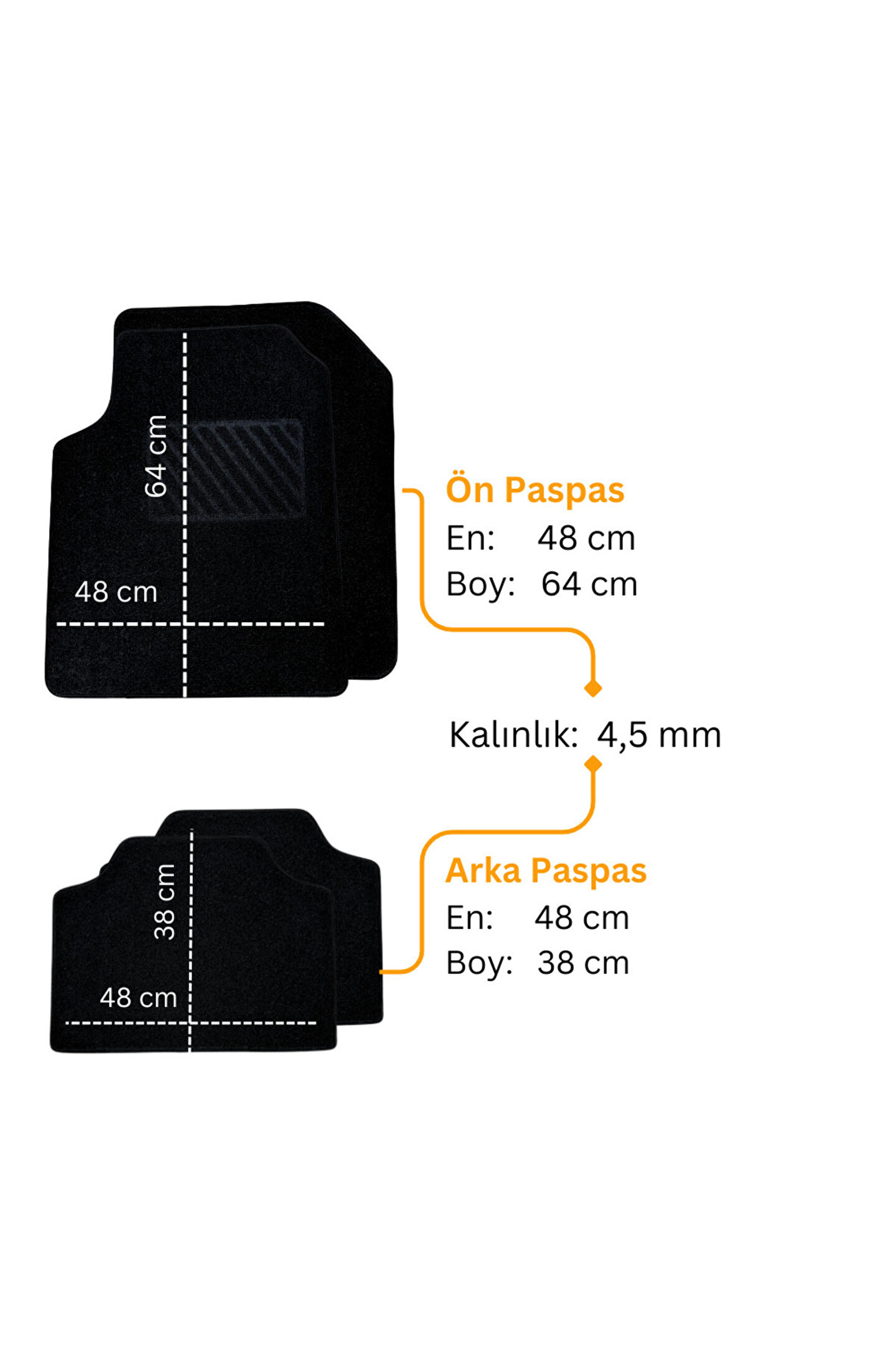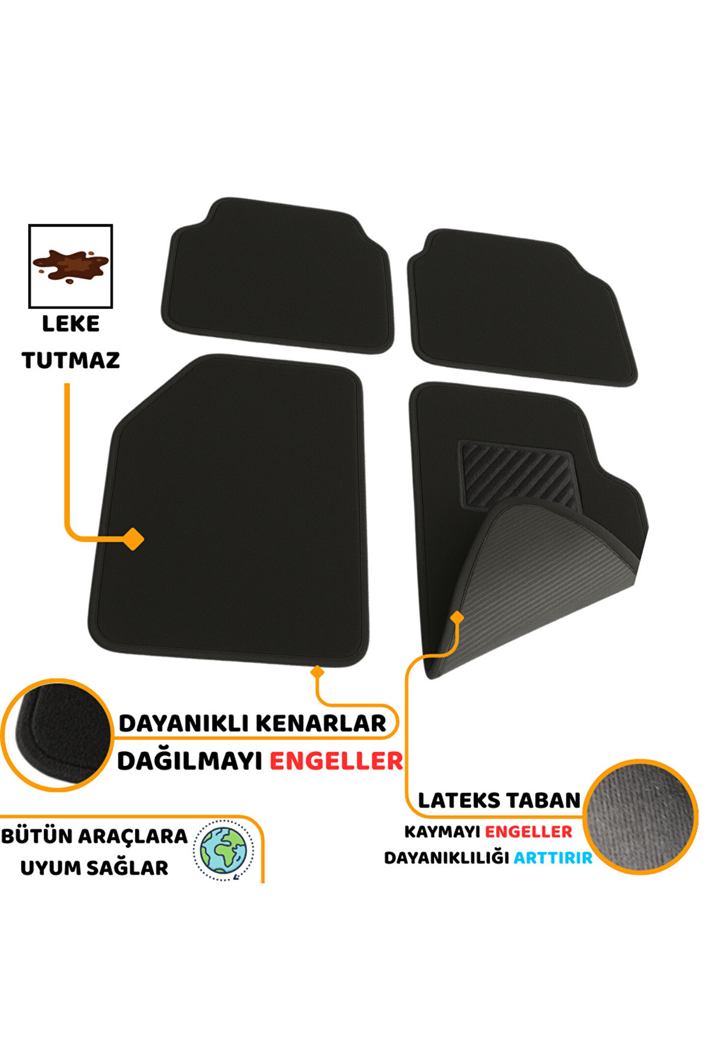 Paket İçeriği : 2 ön 2 arka toplam 4 parçadan oluşmaktadır ; Malzeme : Yüzey kısmı Nonwoven dokuma PES keçedir.; Zemin is lateks ile zemine tutunarak kaydırmaz ; Temizleme : Makina ve el yıkamasına uygundur.; Kuru temizle, silme , çırpma ile rahatlıkla temizlenebilir.; ; Tarz : Tüm çevreleri şık dekoratif kaliteli biye ile sık dikiş ile üretilmiştir.; Sürücü parçası sıcak baskı ile görsellik verilmiştir.; ; Ölçü : Detaylı ölçüler görsellerde belirtilmiştir.; ; Uyumluluk: Tüm araç marka, modellerine sorunsuzca uygulanabilir.