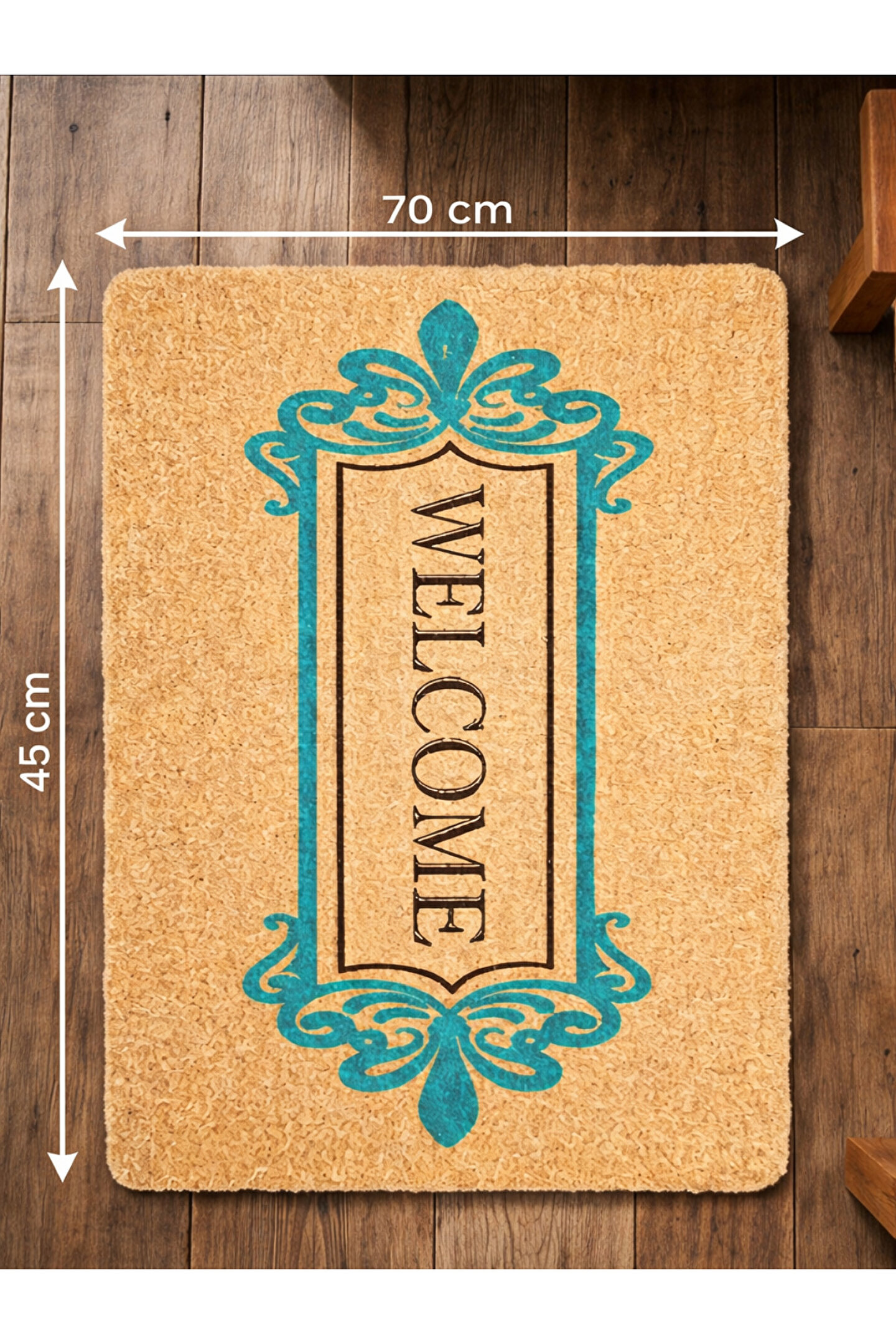 Özgün Tasarım ve Estetik Detaylar: Paspasın doğal lif dokulu kahverengi zemini, sıcak ve davetkar bir atmosfer yaratır. Bu doğal zemin üzerine işlenmiş, klasik motiflerden esinlenen turkuaz renkli zarif kenar süslemeleri, ürüne hem modern hem de otantik bir karakter kazandırır. Ortadaki dikey "WELCOME" yazısı, kontrast oluşturan siyah rengiyle net bir şekilde okunur ve şık bir odak noktası oluşturur. Renklerin uyumu ve desenlerin zarafeti, minimalistten klasiğe kadar pek çok farklı dekorasyon tarzıyla mükemmel bir şekilde bütünleşir.