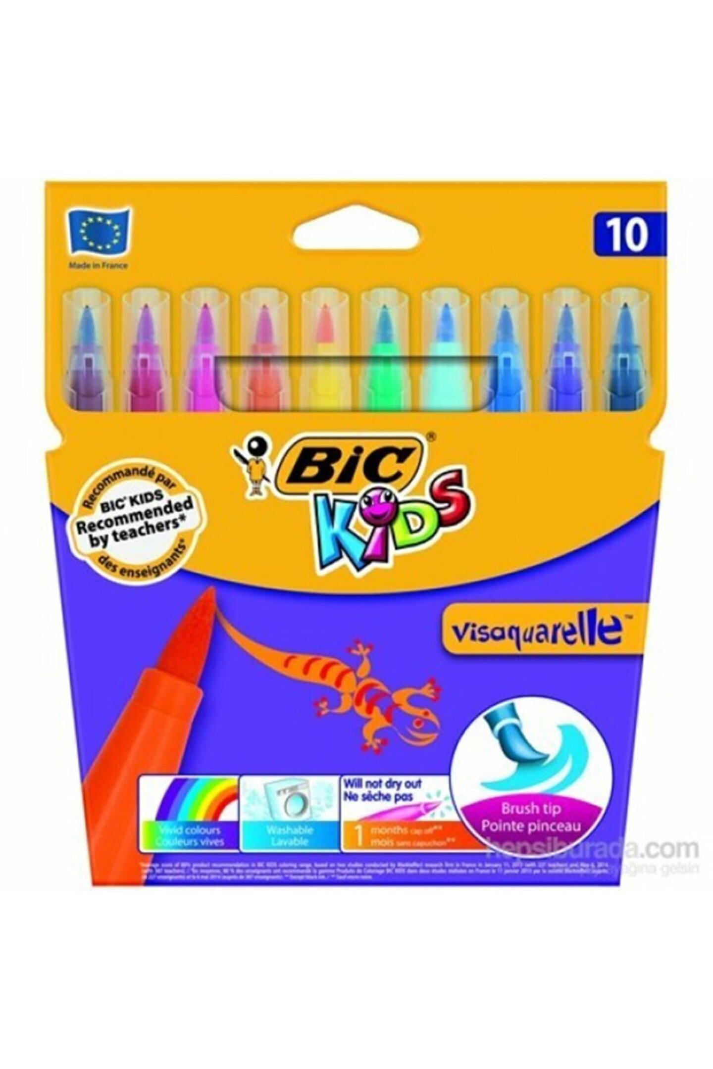Bic Vısa Fırça Uçlu Keçeli Boya Kalemi 10'Lu Kutu Canlı renkler.; ; Yıkanabilir mürekkep.; ; 10 farklı renk seçeneği Ultra dayanıklı uç: 4Kg basınca dayanıklıdır.; ; Sağlam tıkaç, kolay çıkmaz.; ; Kapak açık kalsa bile kurumaz.; ; Mürekkep bağımsız toksiloji uzmanları tarafından test edilmiştir.; ; Ürün Avrupa oyuncak standartına uygun üretilmiştir.; ; Ağır metal testi bağımsız laboratuvarlar tarafından yapılmıştır.; ; Ürün fitalat içermez.; ; Arka tıkacı güvenlik testlerinden geçmiştir.; ; Su bazlı mürekkep çevre ile dosttur.; ; Ürün PVC içermez.; ; Ürün Adı: Bic Visa Fırça Uçlu 10'lu Keçeli Boya Kalemi Marka: Bic Renk: Çok Renkli Barkod: 3270220001553;