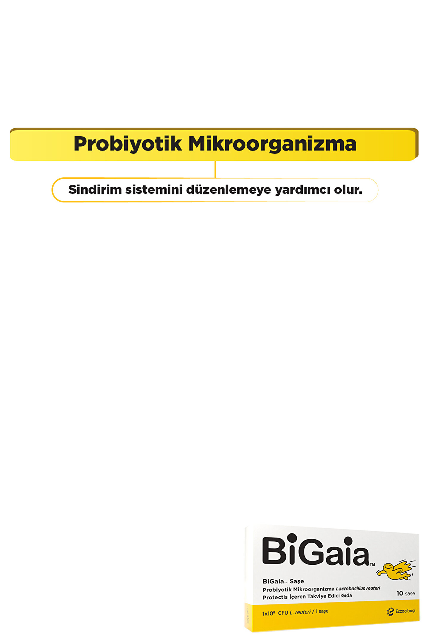 Probiyotik 10’lu Saşe - Sindirim Sistemi&Bağışıklık&Bağırsak Desteği;BiGaia Saşe, probiyotik mikroorganizma L. reuteri Protectis (DSM 17938) içerir. ;Probiyotik mikroorganizma, sindirim sistemini düzenlemeye yardımcı olur. ;Her bir BiGaia saşe, 108 (100 Milyon) KOB (Koloni oluşturan birim) aktif liyofilize edilmiş Lactobacillus reuteri Protectis suşu içerir. ;Tavsiye Edilen Günlük Alım Dozu;2 yaş ve üzeri bireylerde günde 1-2 saşe kullanılması önerilir. ;BiGaia Saşe Nasıl Kullanılır?;• Bir saşeyi okların olduğu yerden yırtarak açınız.;• Saşe içindeki tozu yiyecek ve içeceklerle karıştırabilirsiniz.;• Toz, yiyecek ve içeceklerin tadını değiştirmez.;*Isı, canlı bakteriye zarar verebileceği için ürün sıcak içecek ve yiyeceklere eklenmemelidir.