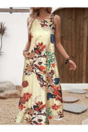 Bijuterria Kadın Askılı Yuvarlak Yaka Cepli Desenli Süprem Elbise