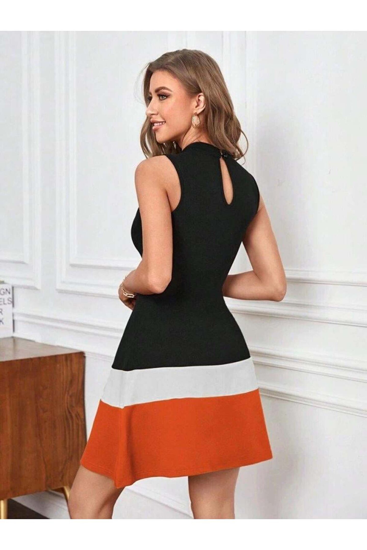 Kadın Sıfır Kol Yarı Balıkçı Yaka şerit Detaylı Ithal Krep Elbise