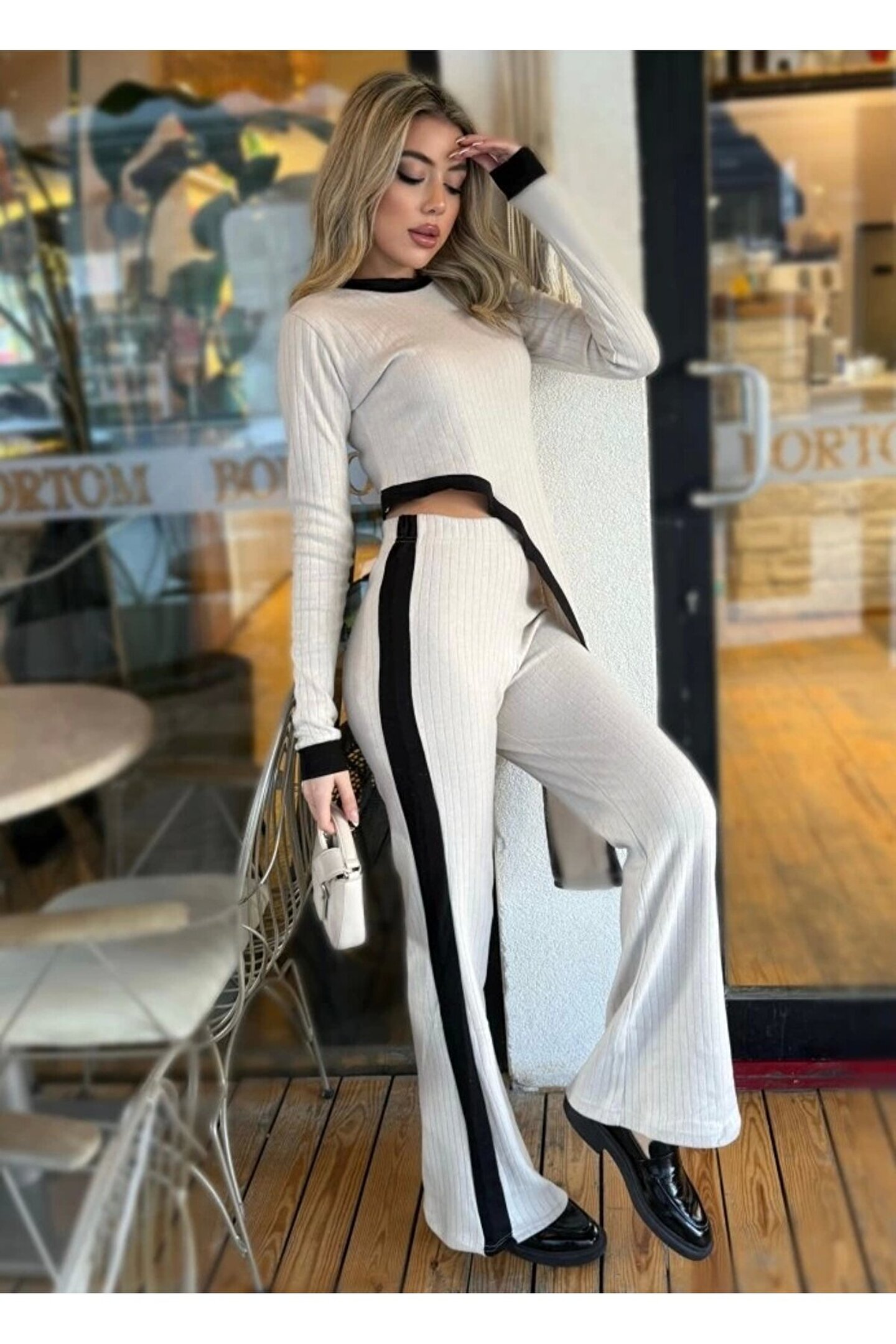 Kadın Uzun Kollu Bisiklet Yaka Asimetrik Kesim Bluz şardonlu Kaşkorse Bluz Ve Pantolon Ikili Takım