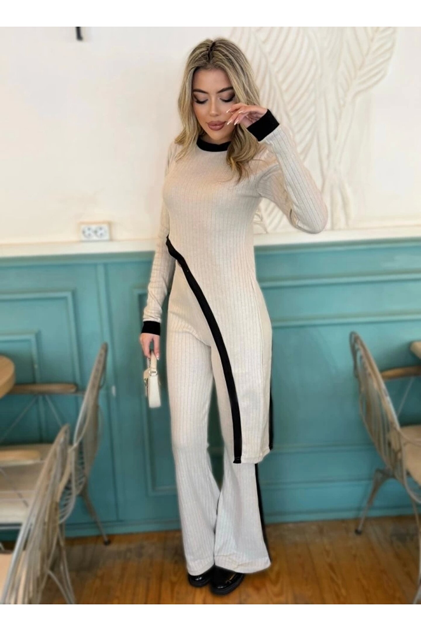 Bijuterria Kadın Uzun Kollu Bisiklet Yaka Asimetrik Kesim Bluz şardonlu Kaşkorse Bluz Ve Pantolon Ikili Takım