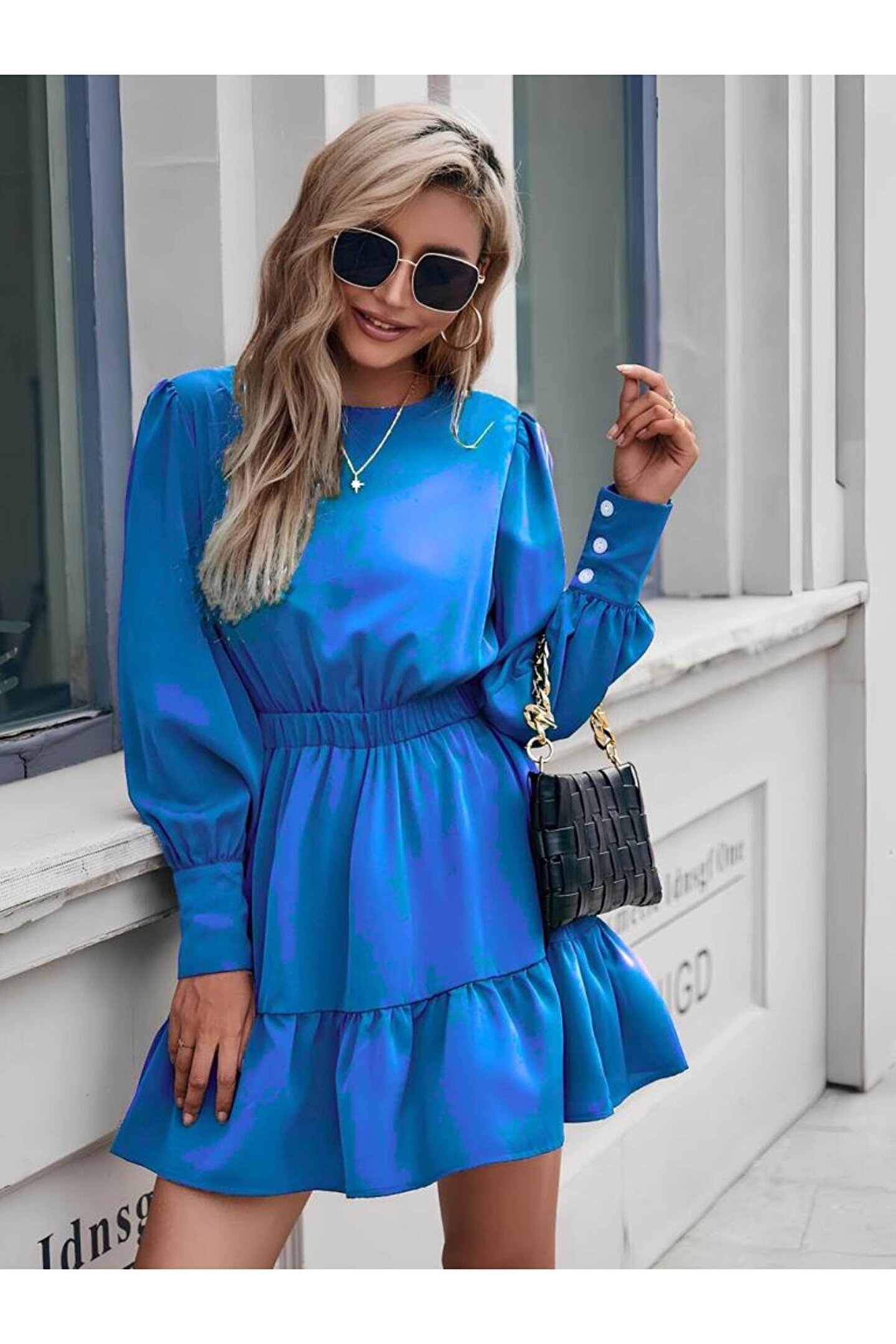 Kadın Uzun Kollu Bisiklet Yaka Beli Lastikli Fırfırlı Ithal Krep Elbise