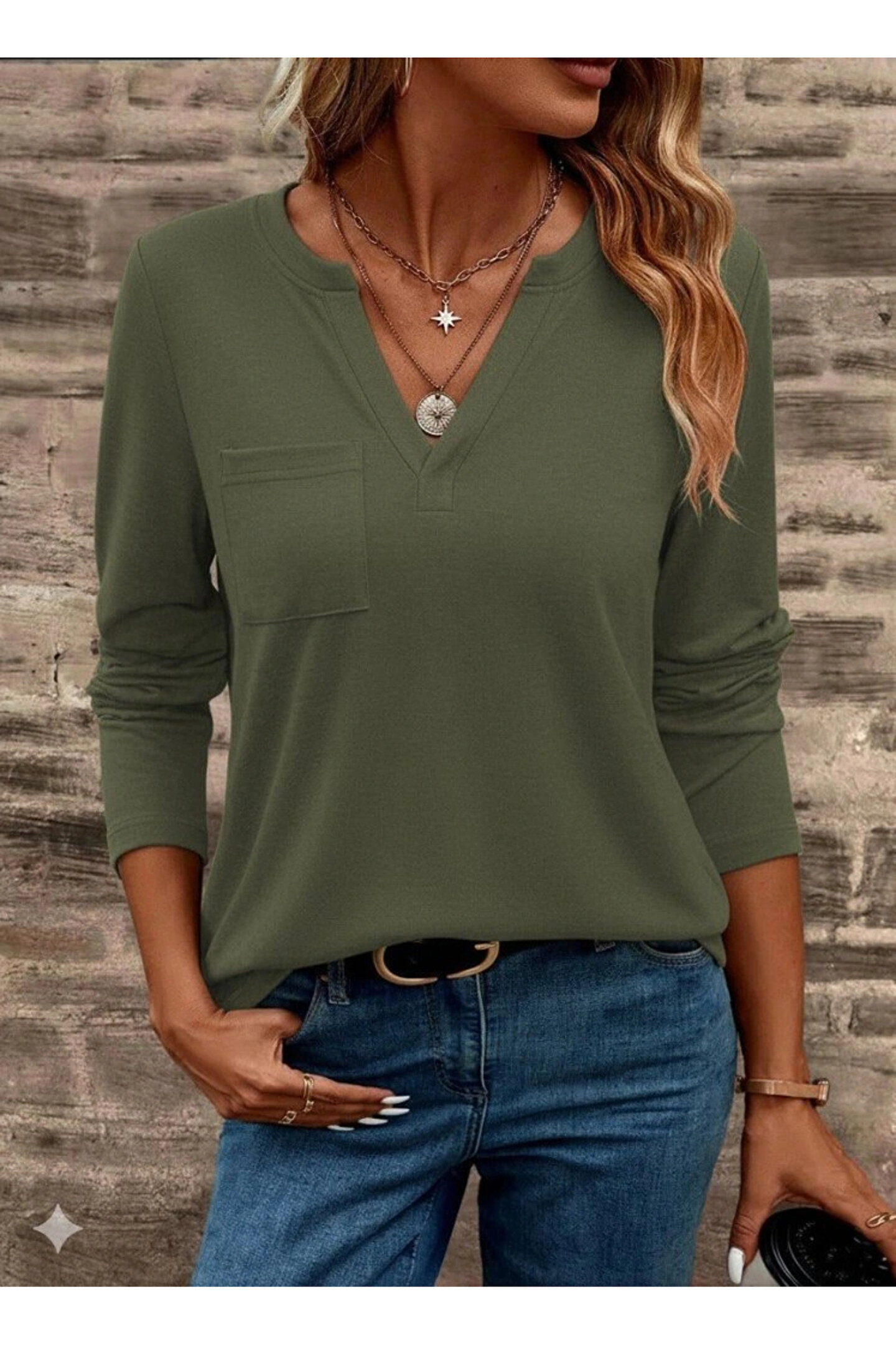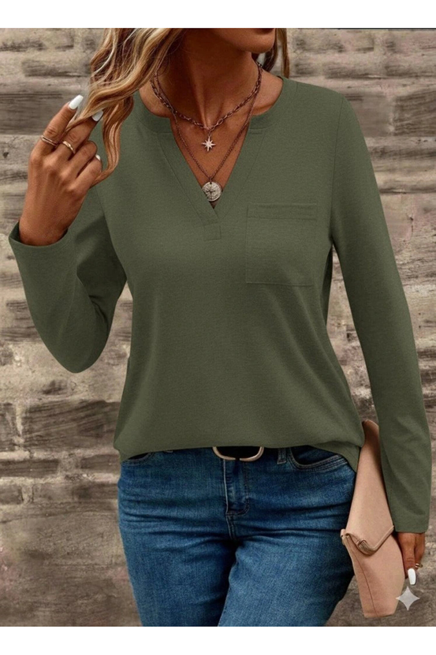Bijuterria Kadın Uzun Kollu Cepli V Yakalı Viskon Iki Iplik Bluz