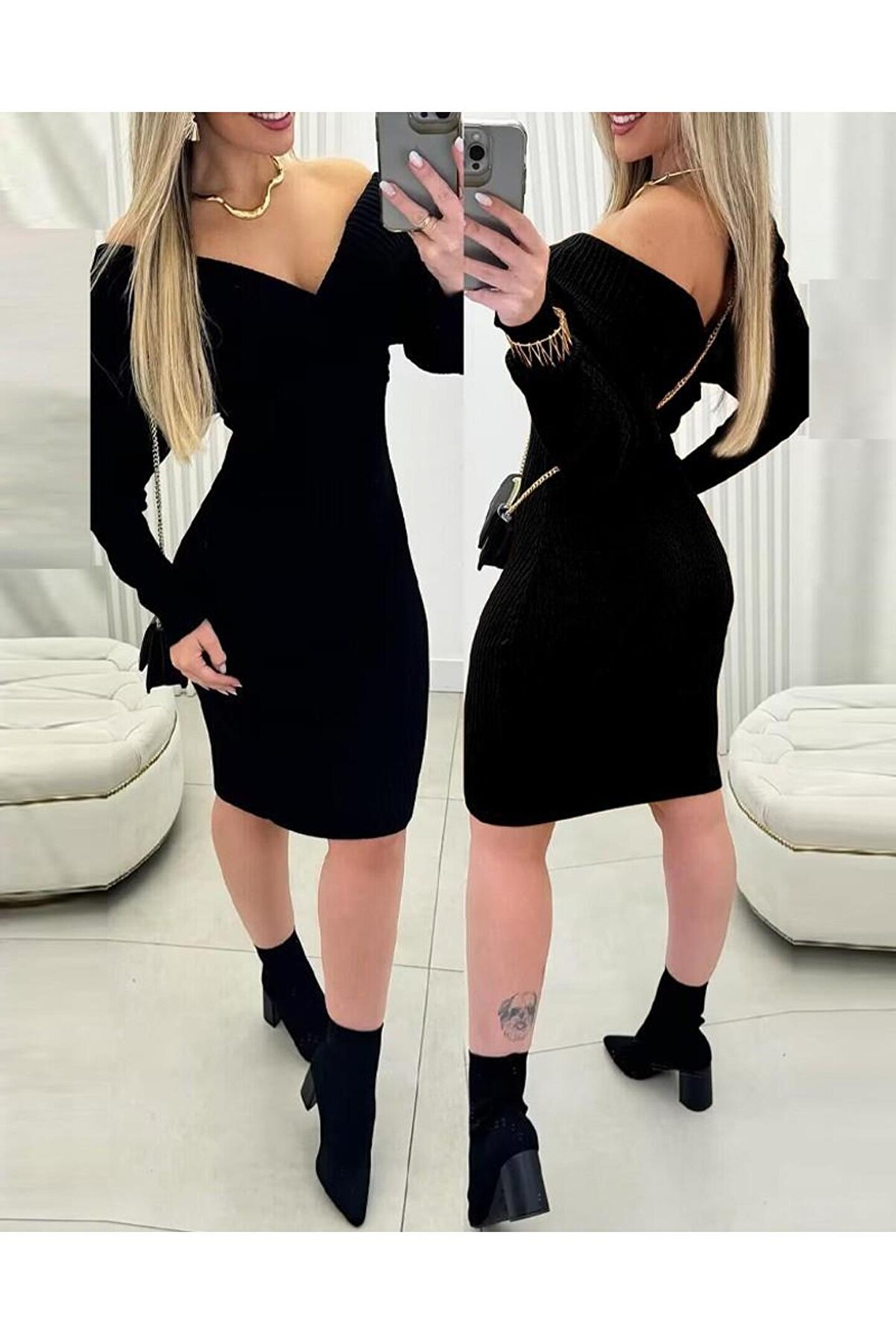 Bijuterria Kadın Uzun Kollu Omuzlardan Açık Kruvaze Yaka Kısa Triko Elbise