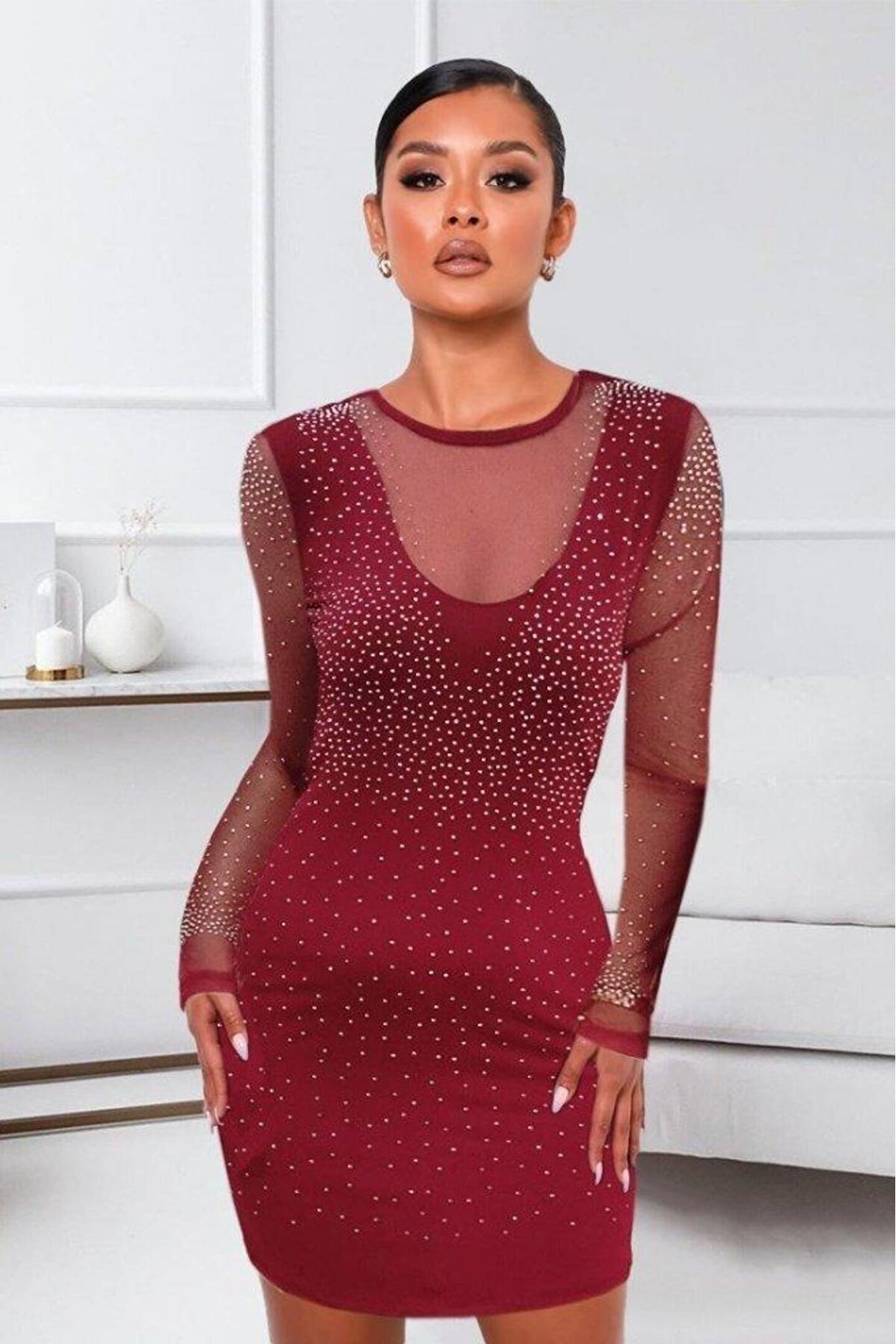 Bijuterria Kadın Uzun Kollu Yuvarlak Yaka Dekolteli Taşlı Dalgıç Elbise