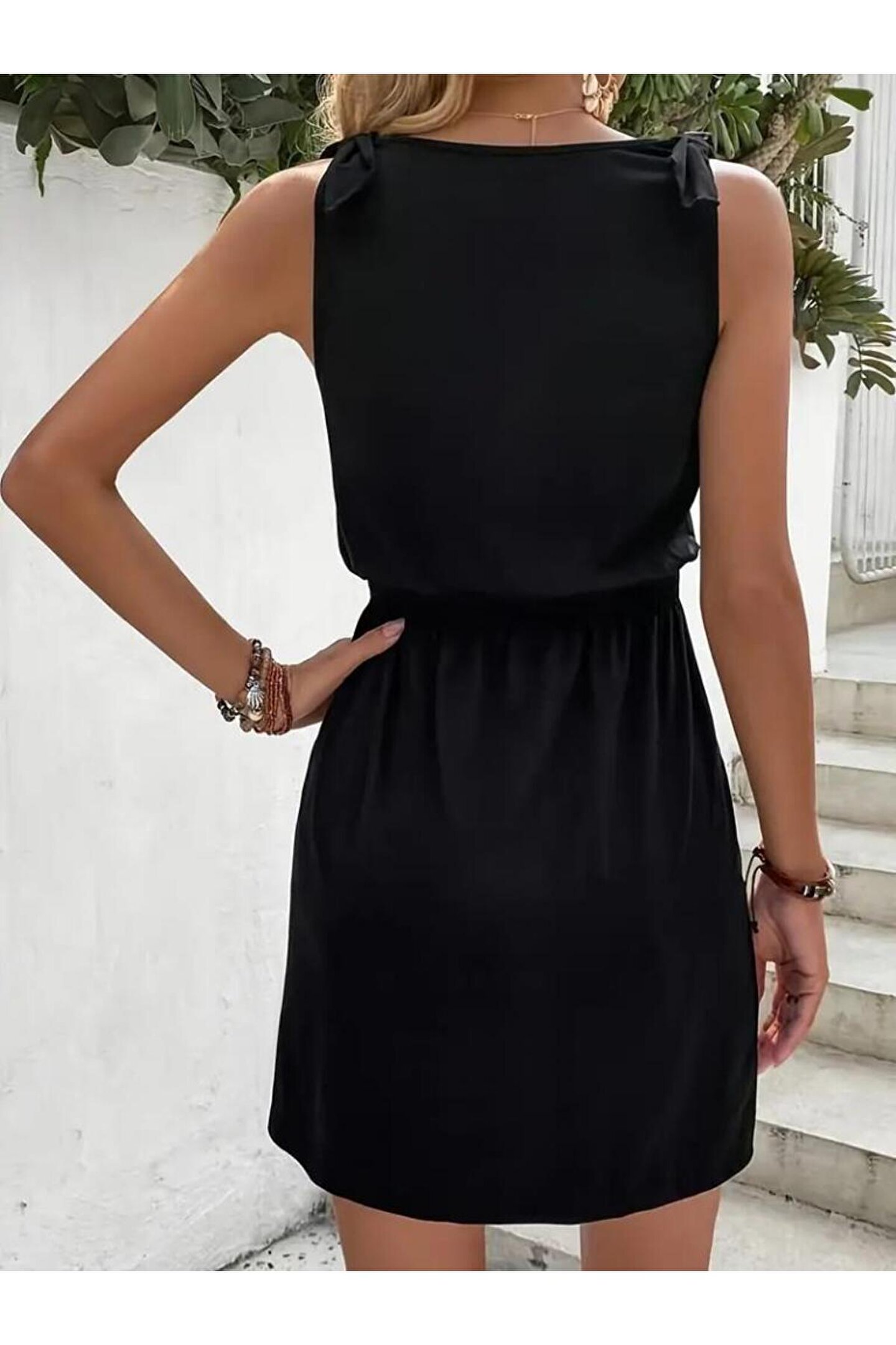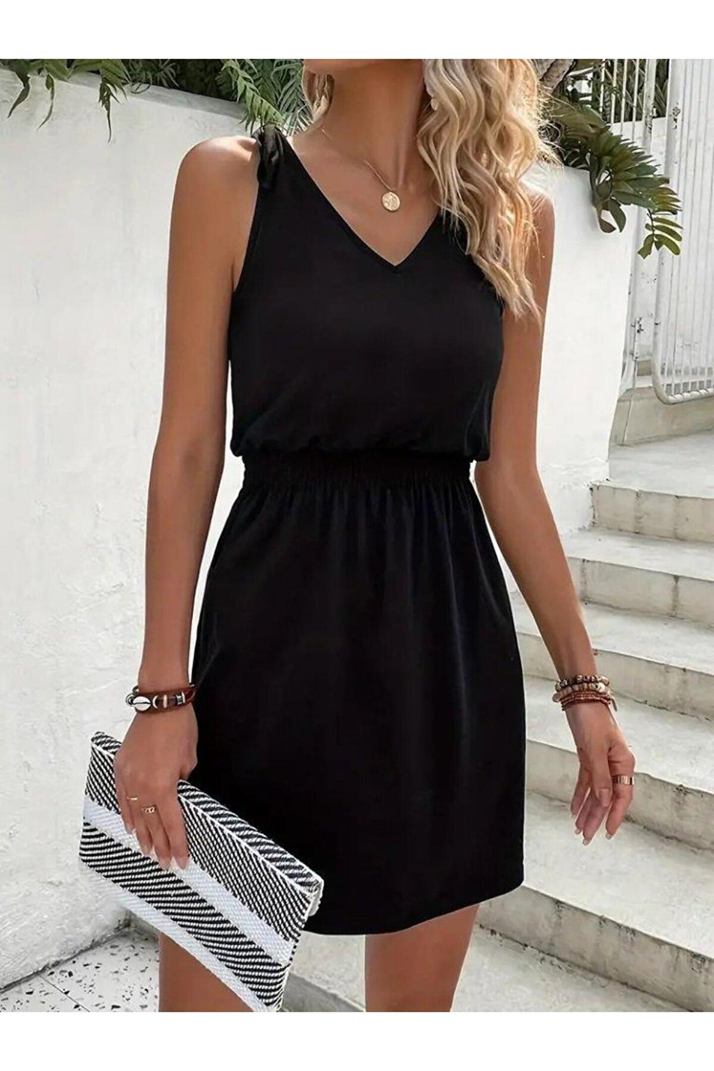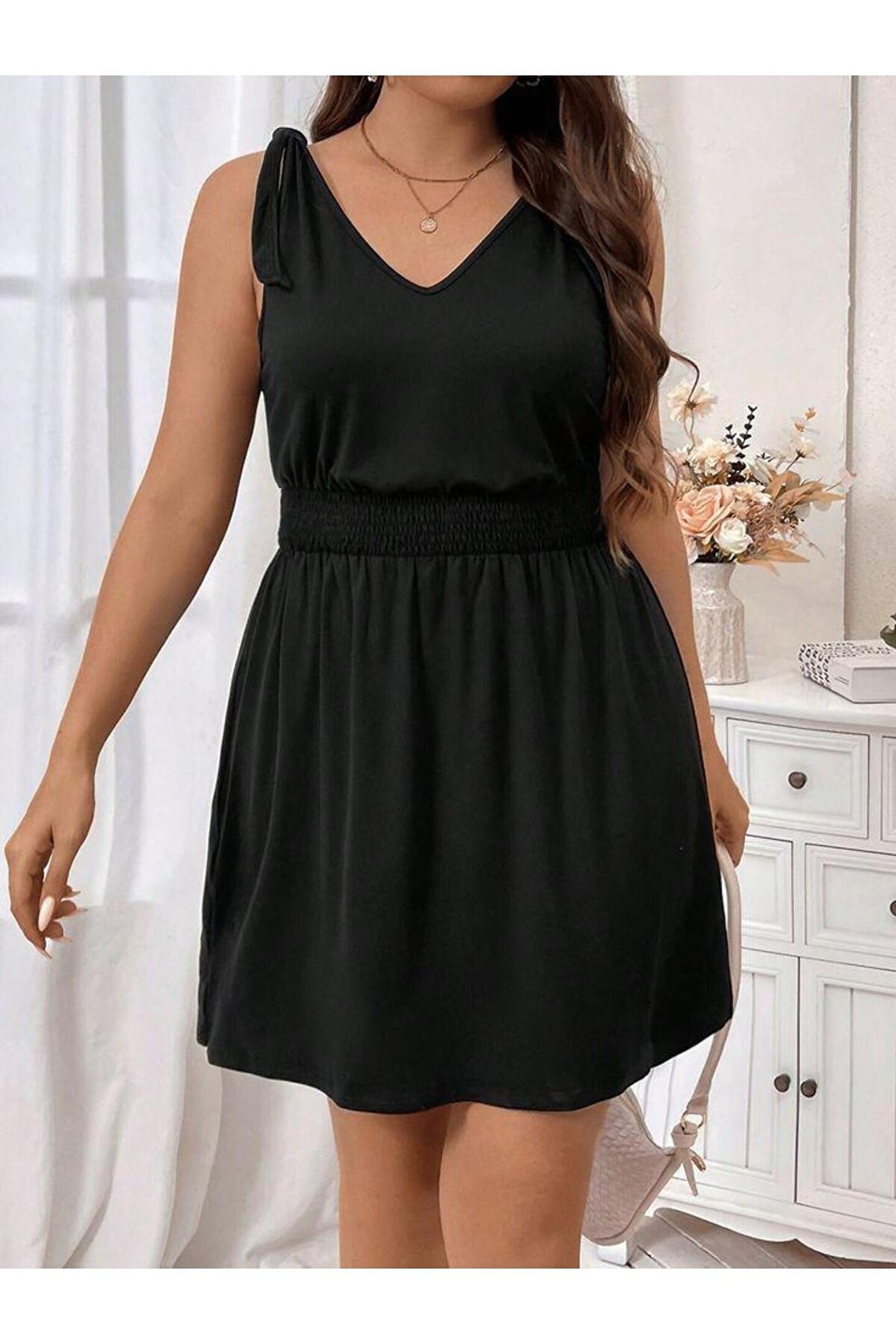Kadın V Yakalı Belinde Gipe Detay Krep Elbise