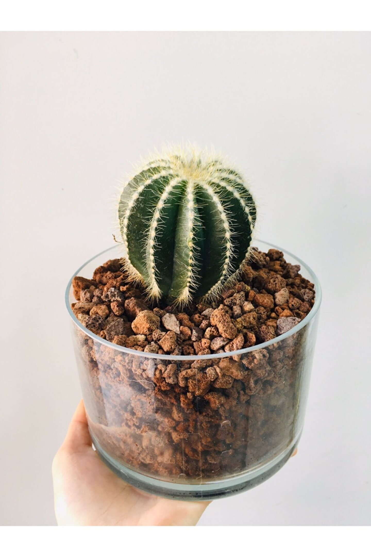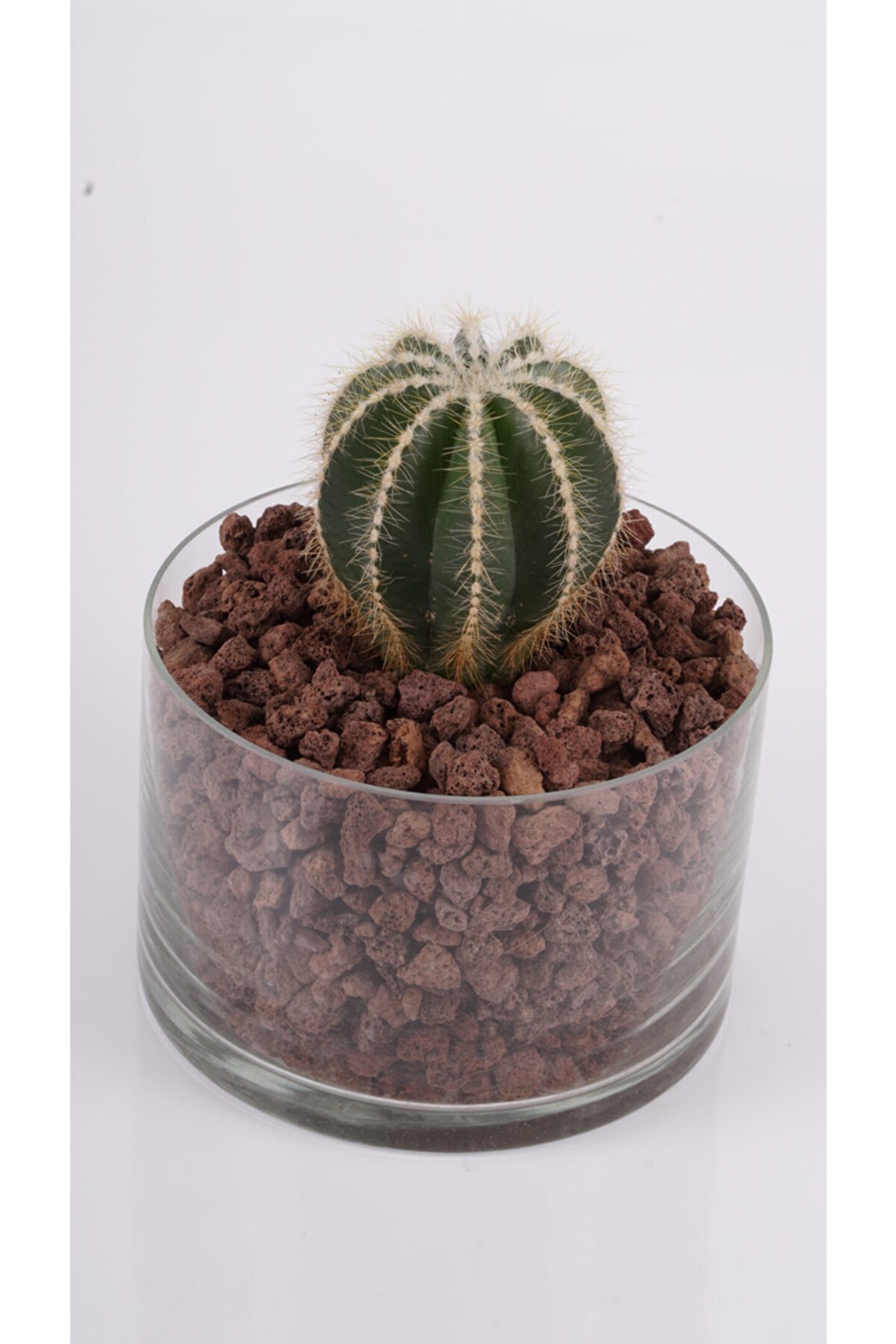 15 cm çapında 19 cm boyunda kaktüs bitkili lav taşlı orta boy cam saksı