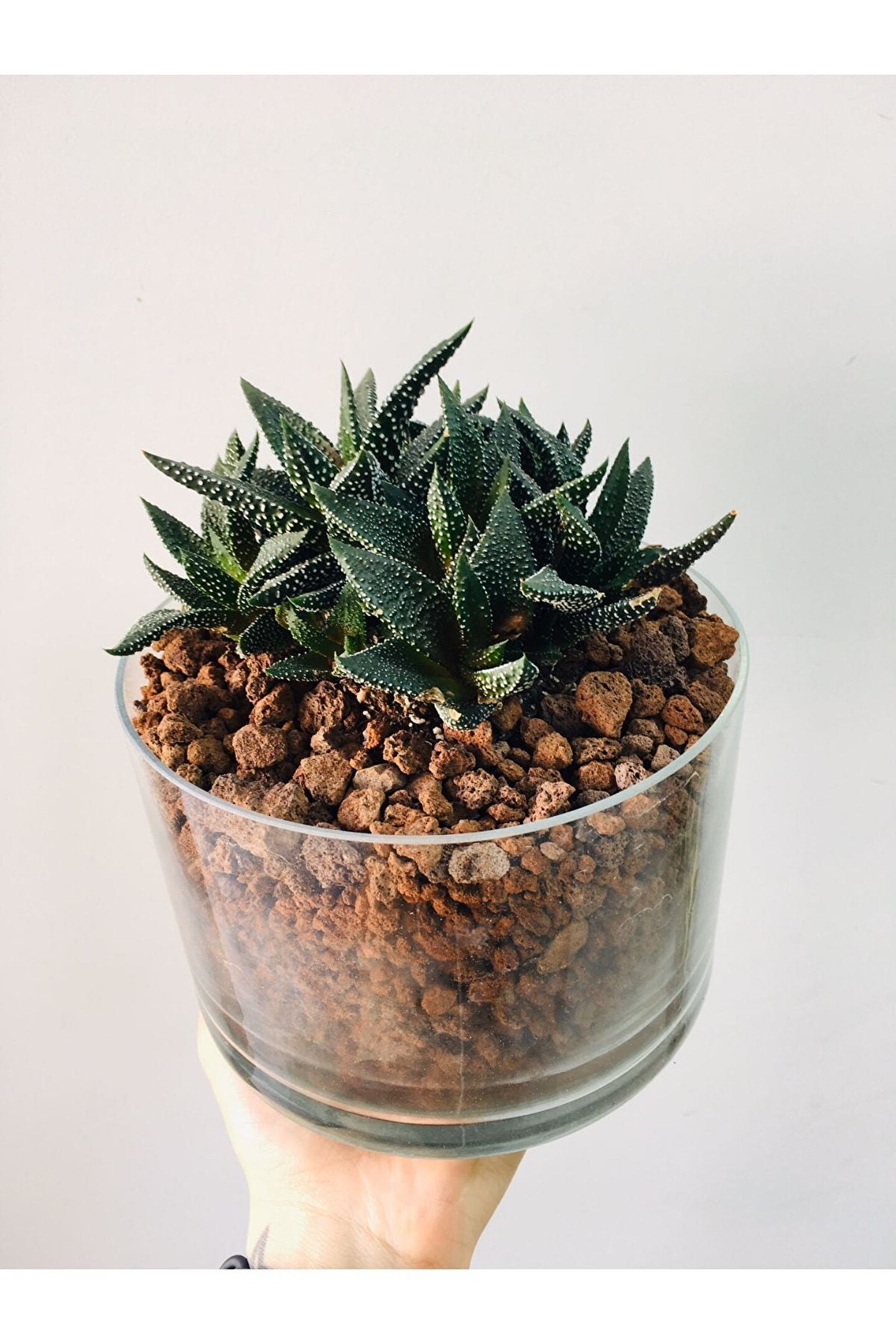 15 cm çapında 19 cm boyunda zebra bitkili lav taşlı orta boy cam saksı