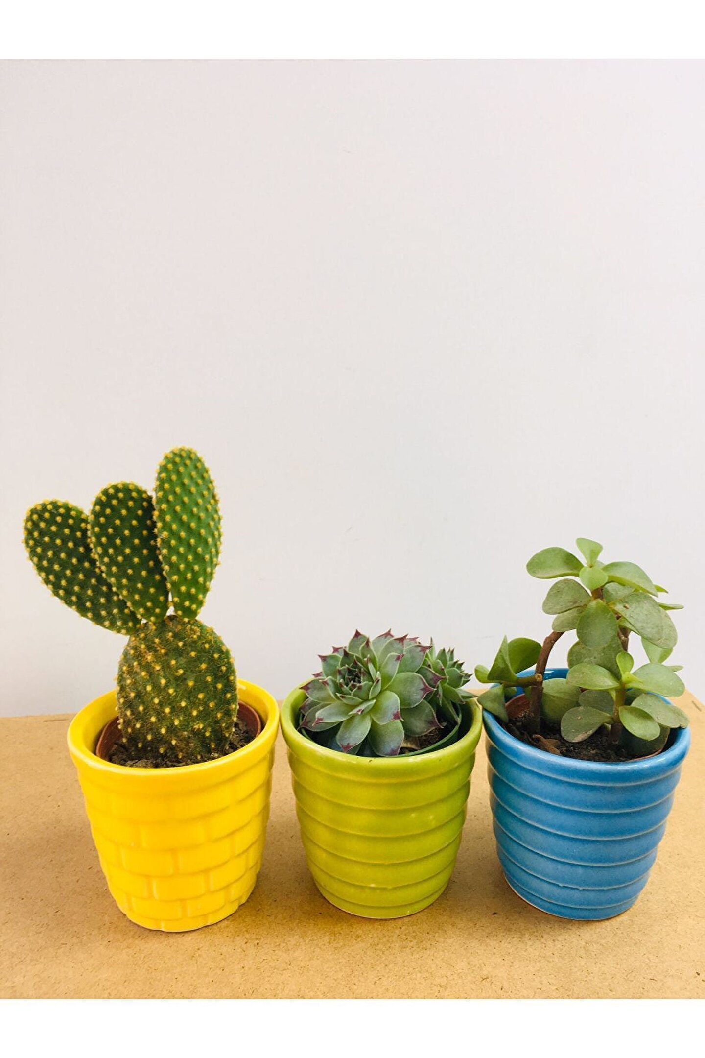 6 cm boyunda, 6 cm çapında 3lü sarı, yeşil, mavi saksıda tavşan kulağı, semper, para ağacı