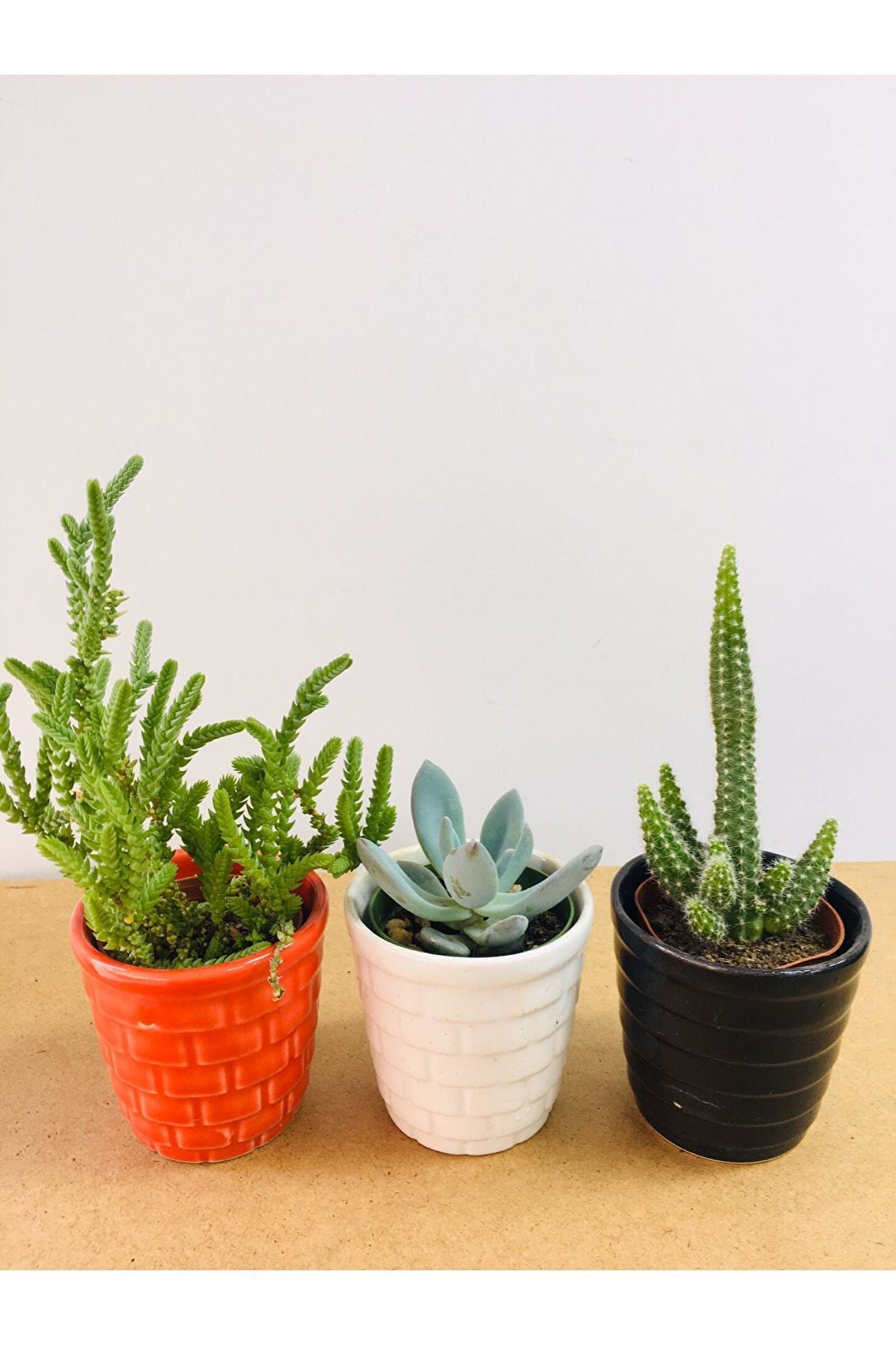 6 cm boyunda, 6 cm çapında 3lü siyah, beyaz, kırmızı saksıda prenses çamı, sukulent, kaktüs