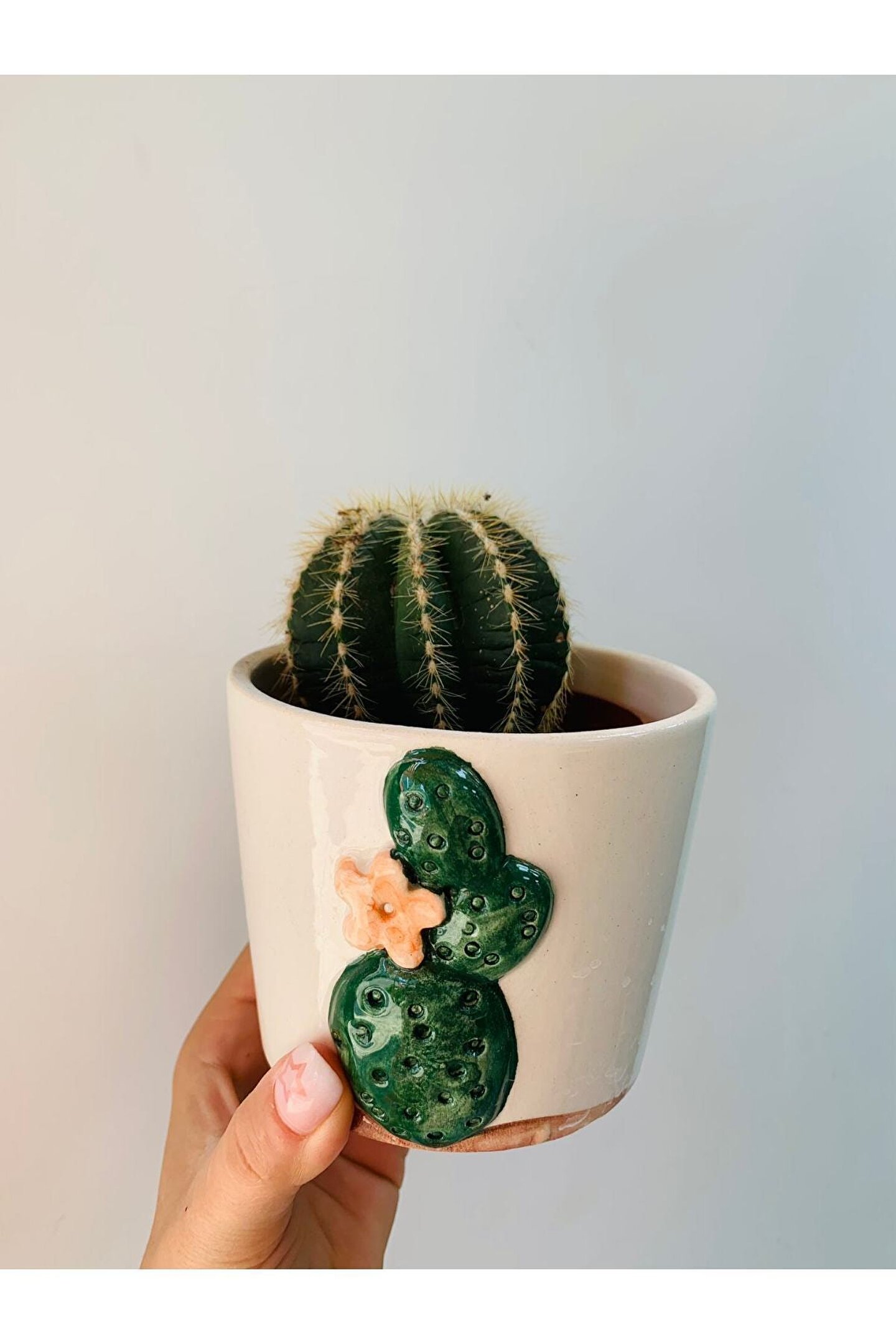 14 cm boyunda 10 cm çapında seramik saksıda ekili beyaz top kaktüs