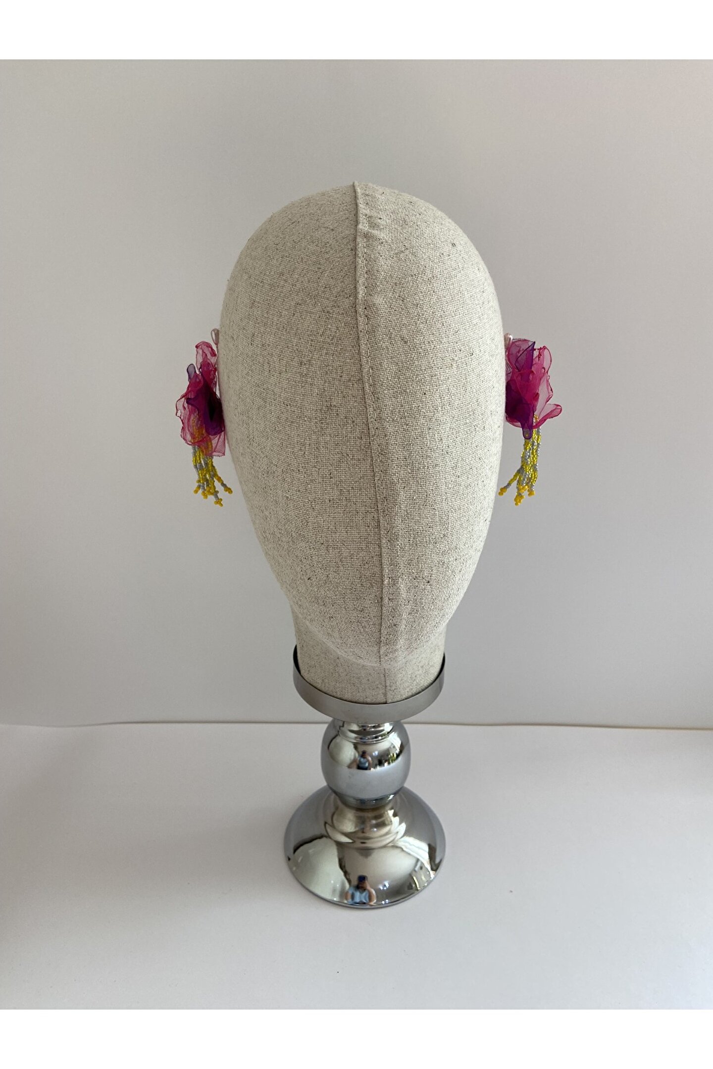 Cemil İpekçi'nin özel defilesi için tasarlanmış bu şık küpe seti, zarafeti ve modern estetiği bir araya getiriyor. Eşsiz mor ve pembe tül detayları, sarı ve gri kum boncuk sallantılarıları ile bezeli bu küpeler, göz alıcı renklerin ve dokuların harmanlanmasını sunarak her tarza mükemmel bir uyum sağlar.