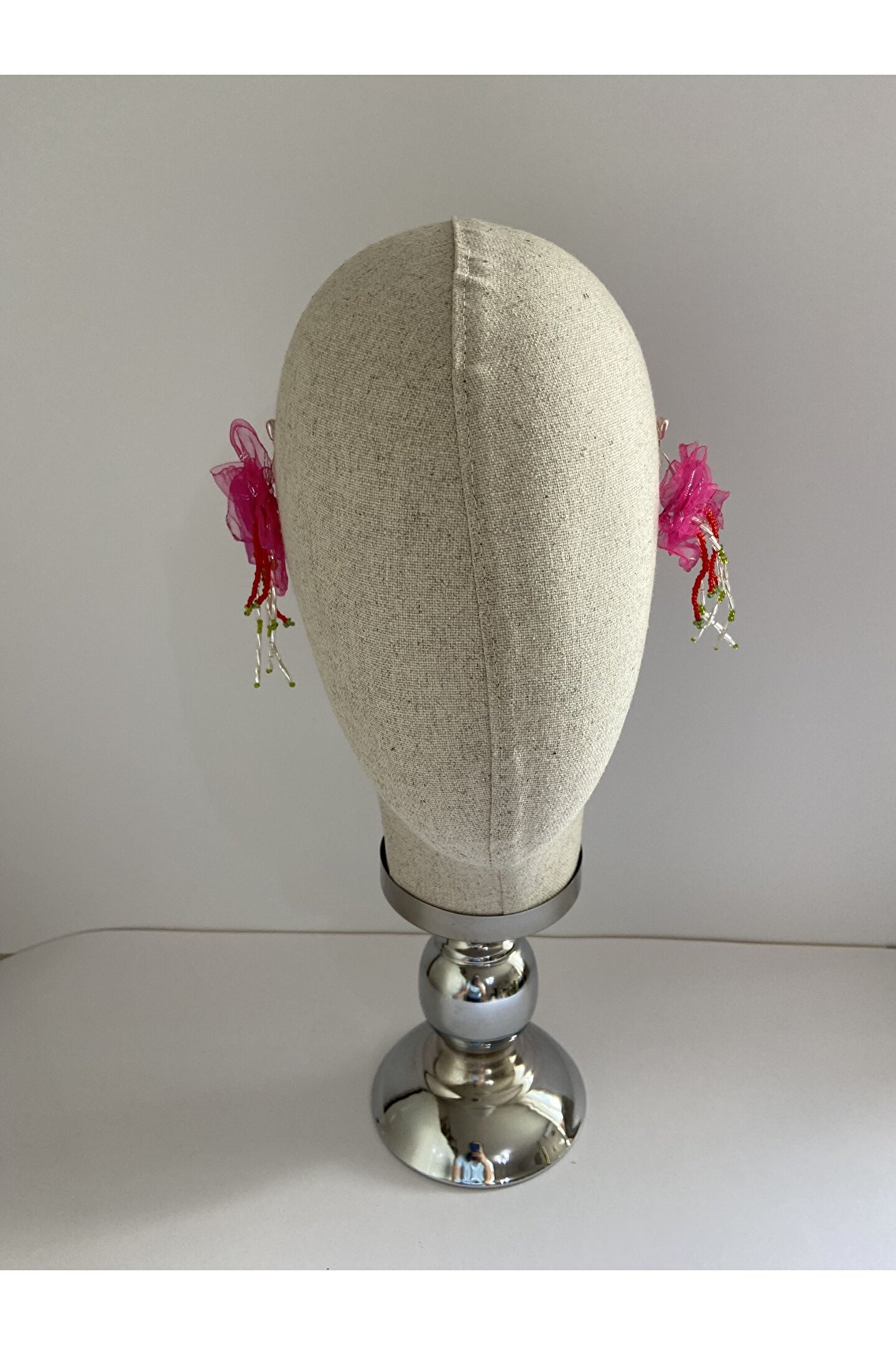 Cemil İpekçi'nin özel defilesi için tasarlanmış bu şık küpe seti, zarafeti ve modern estetiği bir araya getiriyor. Eşsiz pembe tül detayları, kırmızı ve beyaz kum boncuk sallantılarıları ile bezeli bu küpeler, göz alıcı renklerin ve dokuların harmanlanmasını sunarak her tarza mükemmel bir uyum sağlar.