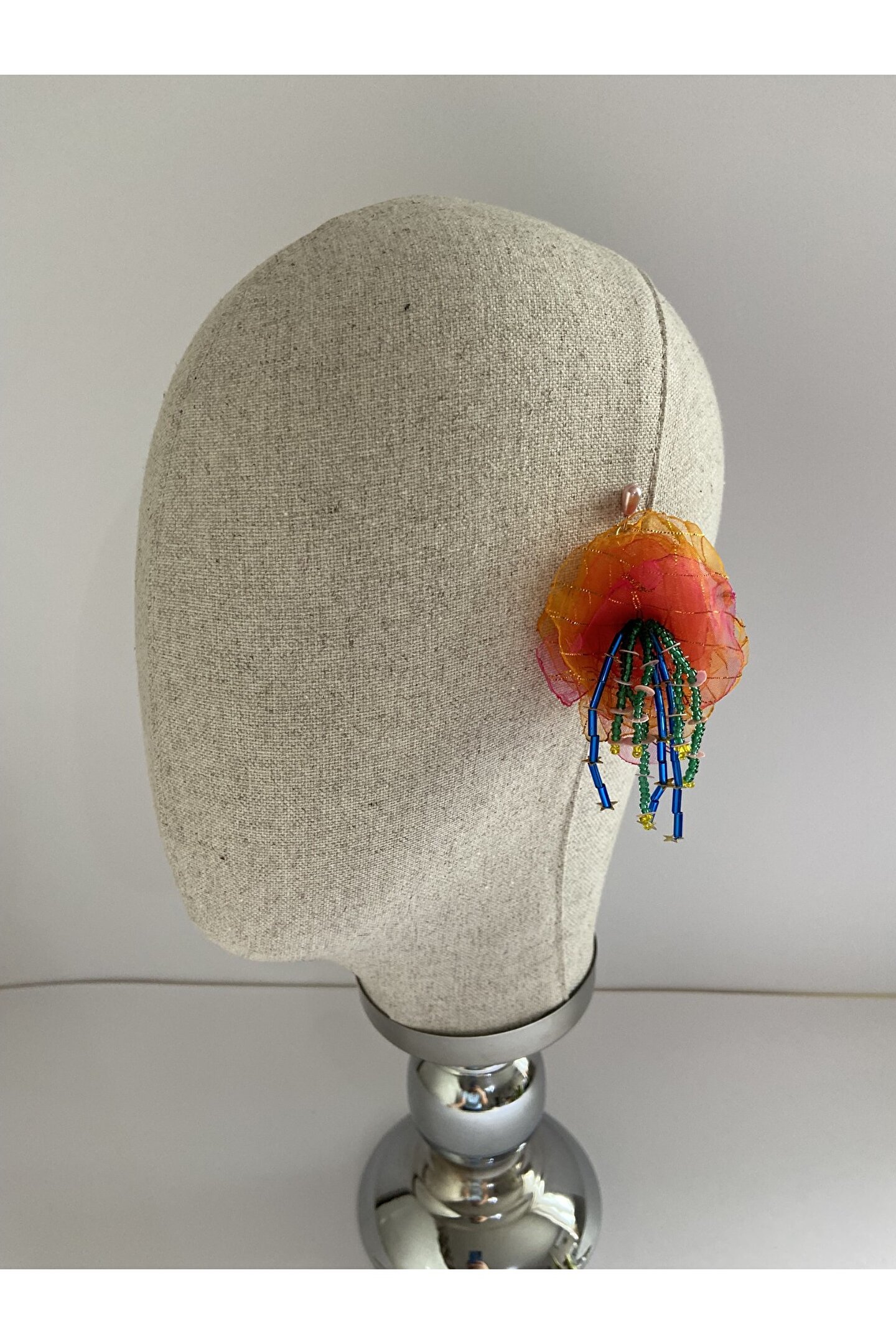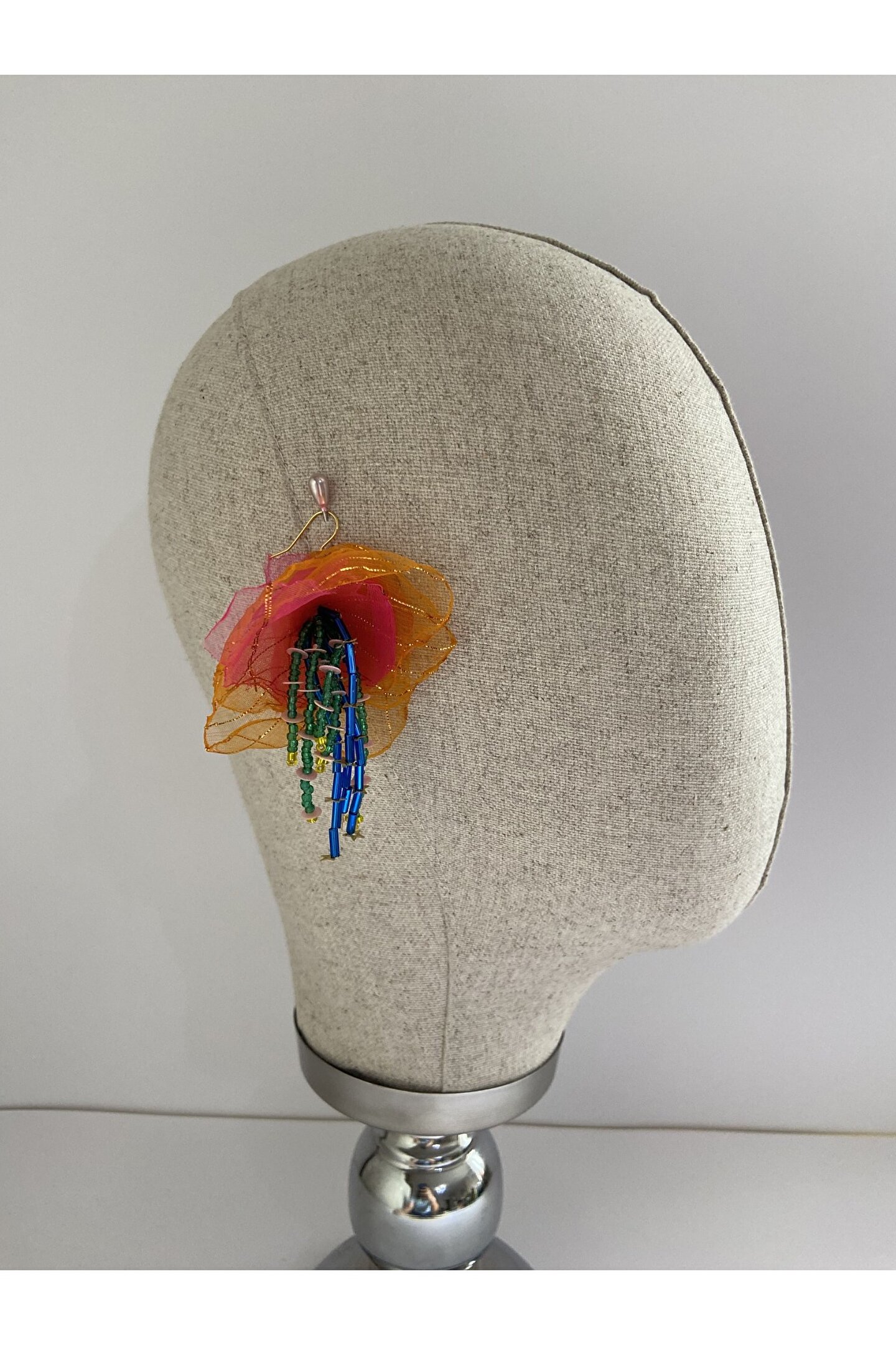 Cemil İpekçi'nin özel defilesi için tasarlanmış bu şık küpe seti, zarafeti ve modern estetiği bir araya getiriyor. Eşsiz sarı ve turuncu tül detayları, mavi ve yeşil kum boncuk sallantılarıları ile bezeli bu küpeler, göz alıcı renklerin ve dokuların harmanlanmasını sunarak her tarza mükemmel bir uyum sağlar