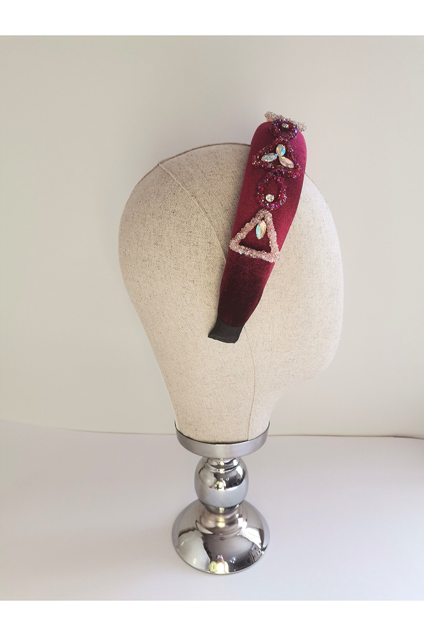 Cemil İpekçi defilesi için özel olarak tasarlanan bu zarif taç, kırmızı kadife kumaşıyla şıklığı ve zarafeti bir araya getiriyor. Bir tarafında çiçek motifli boncuklar ve parlak detaylar, diğer tarafında ise cam ve ışıltılı boncuklarla yapılan işlemelerle süslenmiştir. Özel günlerde veya günlük kullanımlarda stilinize şıklık katacak bu taç, her tarza uyum sağlayarak dikkatleri üzerinize çekecek. Kendinizi özel hissetmek için ideal bir aksesuar!