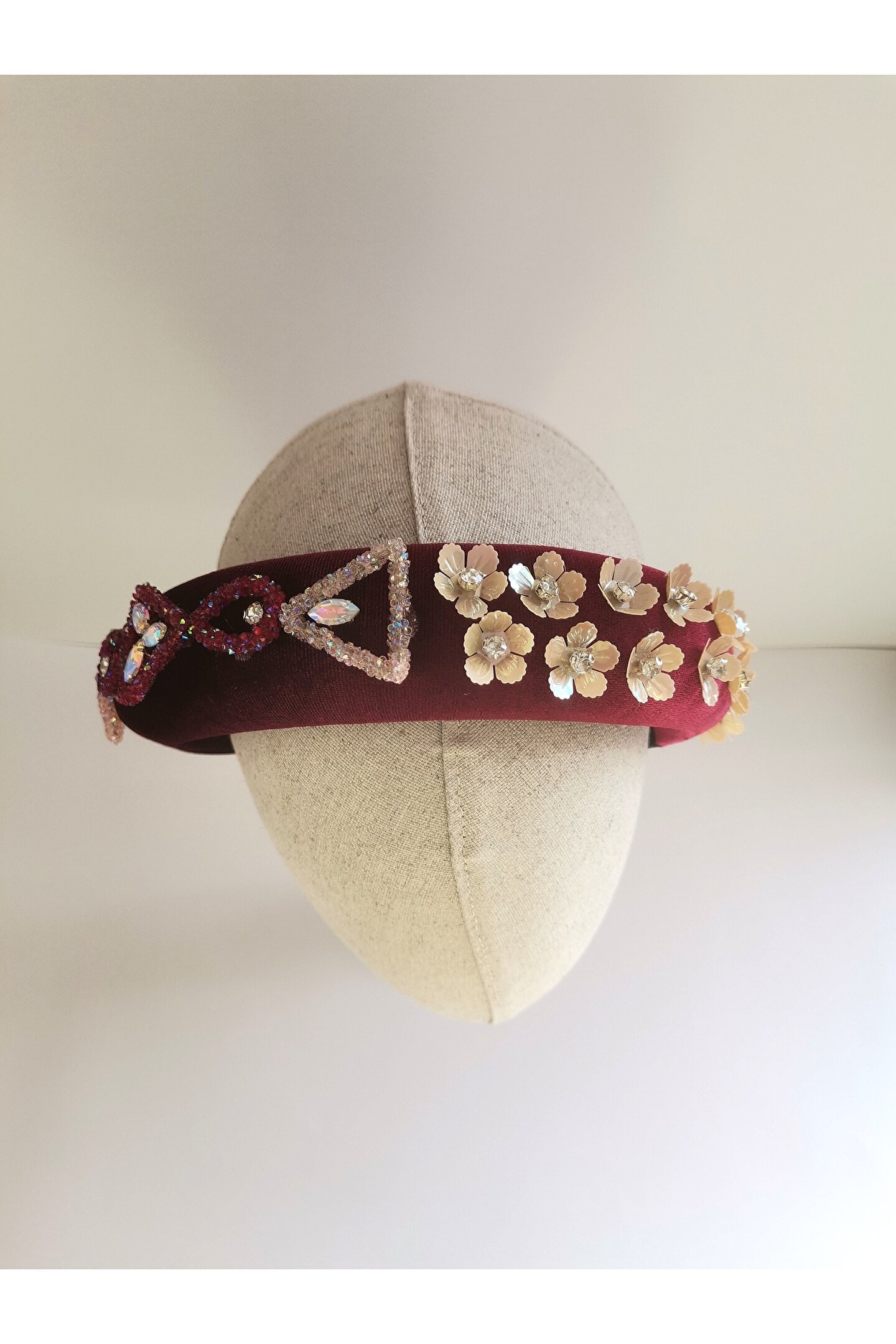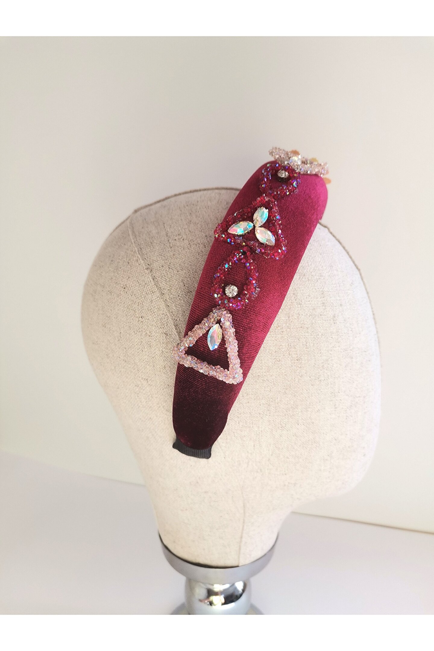 Cemil İpekçi defilesi için özel olarak tasarlanan bu zarif taç, kırmızı kadife kumaşıyla şıklığı ve zarafeti bir araya getiriyor. Bir tarafında çiçek motifli boncuklar ve parlak detaylar, diğer tarafında ise cam ve ışıltılı boncuklarla yapılan işlemelerle süslenmiştir. Özel günlerde veya günlük kullanımlarda stilinize şıklık katacak bu taç, her tarza uyum sağlayarak dikkatleri üzerinize çekecek. Kendinizi özel hissetmek için ideal bir aksesuar!
