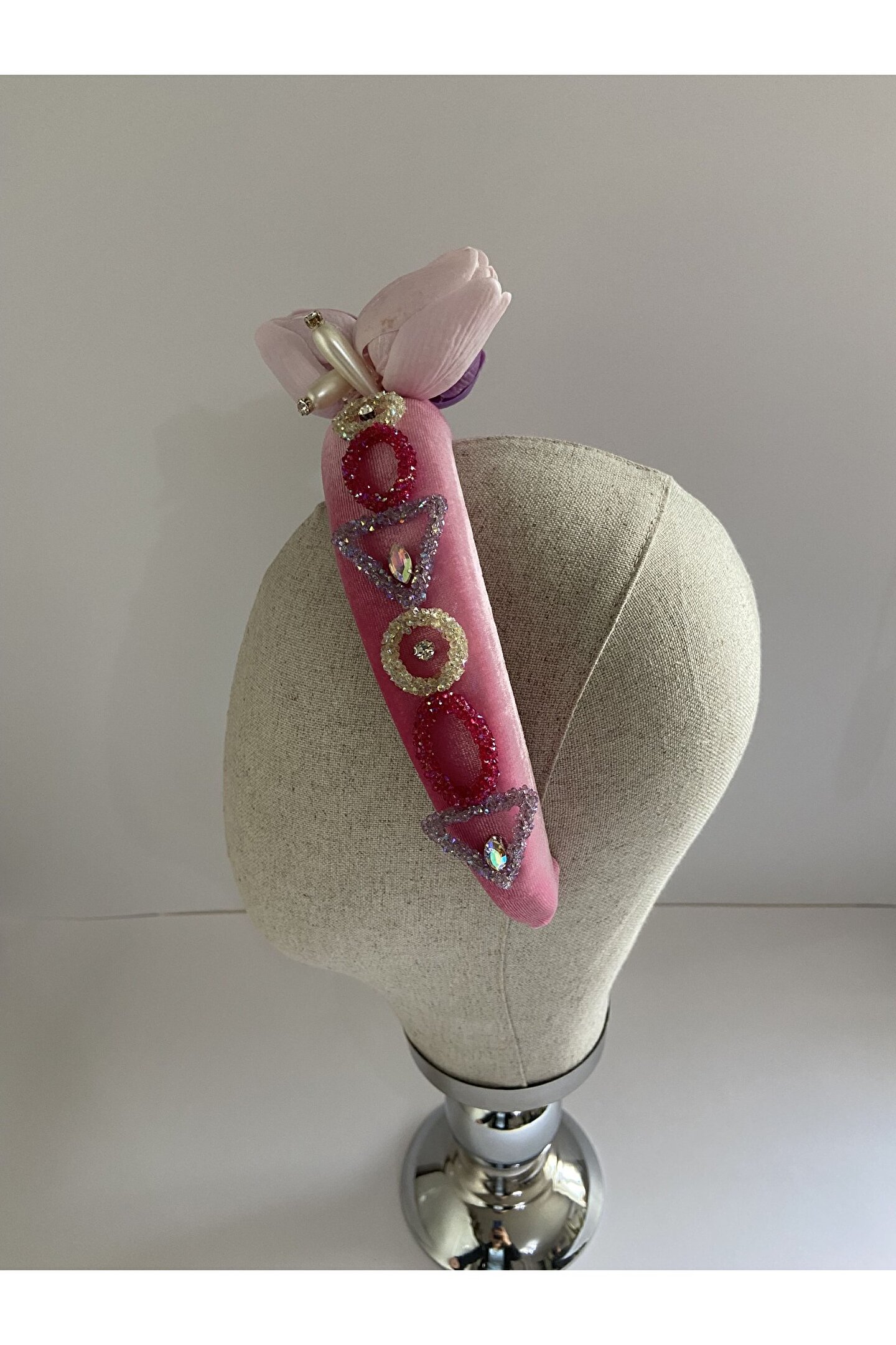 Cemil İpekçi defilesi için özel olarak tasarlanan bu zarif taç, pembe kadife kumaşıyla şıklığı ve zarafeti bir araya getiriyor. Bir tarafında çiçek motifi ve parlak detaylar, diğer tarafında ise cam ve ışıltılı boncuklarla yapılan işlemelerle süslenmiştir. Özel günlerde veya günlük kullanımlarda stilinize şıklık katacak bu taç, her tarza uyum sağlayarak dikkatleri üzerinize çekecek. Kendinizi özel hissetmek için ideal bir aksesuar!