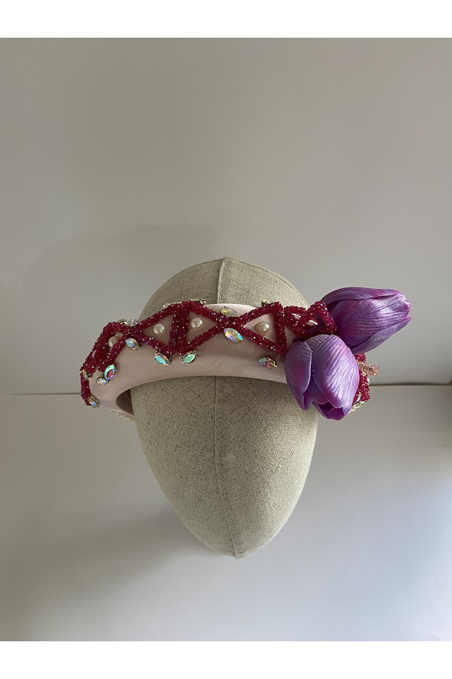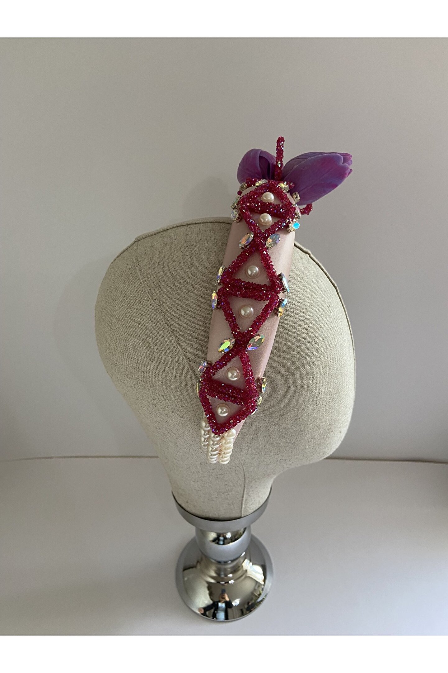 Cemil İpekçi defilesi için özel olarak tasarlanan bu zarif taç, pembe kadife kumaşıyla şıklığı ve zarafeti bir araya getiriyor. Bir tarafında çiçek motifi ve parlak detaylar, diğer tarafında ise cam ve ışıltılı boncuklarla yapılan işlemelerle süslenmiştir. Özel günlerde veya günlük kullanımlarda stilinize şıklık katacak bu taç, her tarza uyum sağlayarak dikkatleri üzerinize çekecek. Kendinizi özel hissetmek için ideal bir aksesuar!