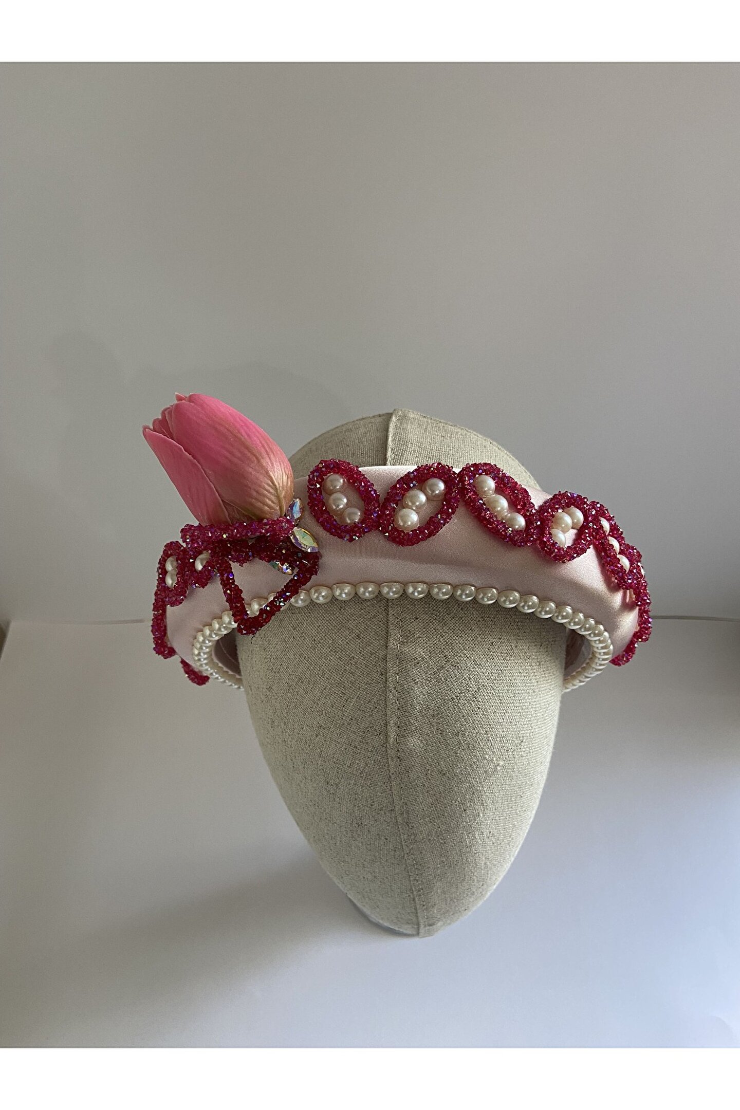 Cemil İpekçi defilesi için özel olarak tasarlanan bu zarif taç, pembe kadife kumaşıyla şıklığı ve zarafeti bir araya getiriyor. Bir tarafında çiçek motifi ve parlak detaylar, diğer tarafında ise cam ve ışıltılı boncuklarla yapılan işlemelerle süslenmiştir. Özel günlerde veya günlük kullanımlarda stilinize şıklık katacak bu taç, her tarza uyum sağlayarak dikkatleri üzerinize çekecek. Kendinizi özel hissetmek için ideal bir aksesuar!