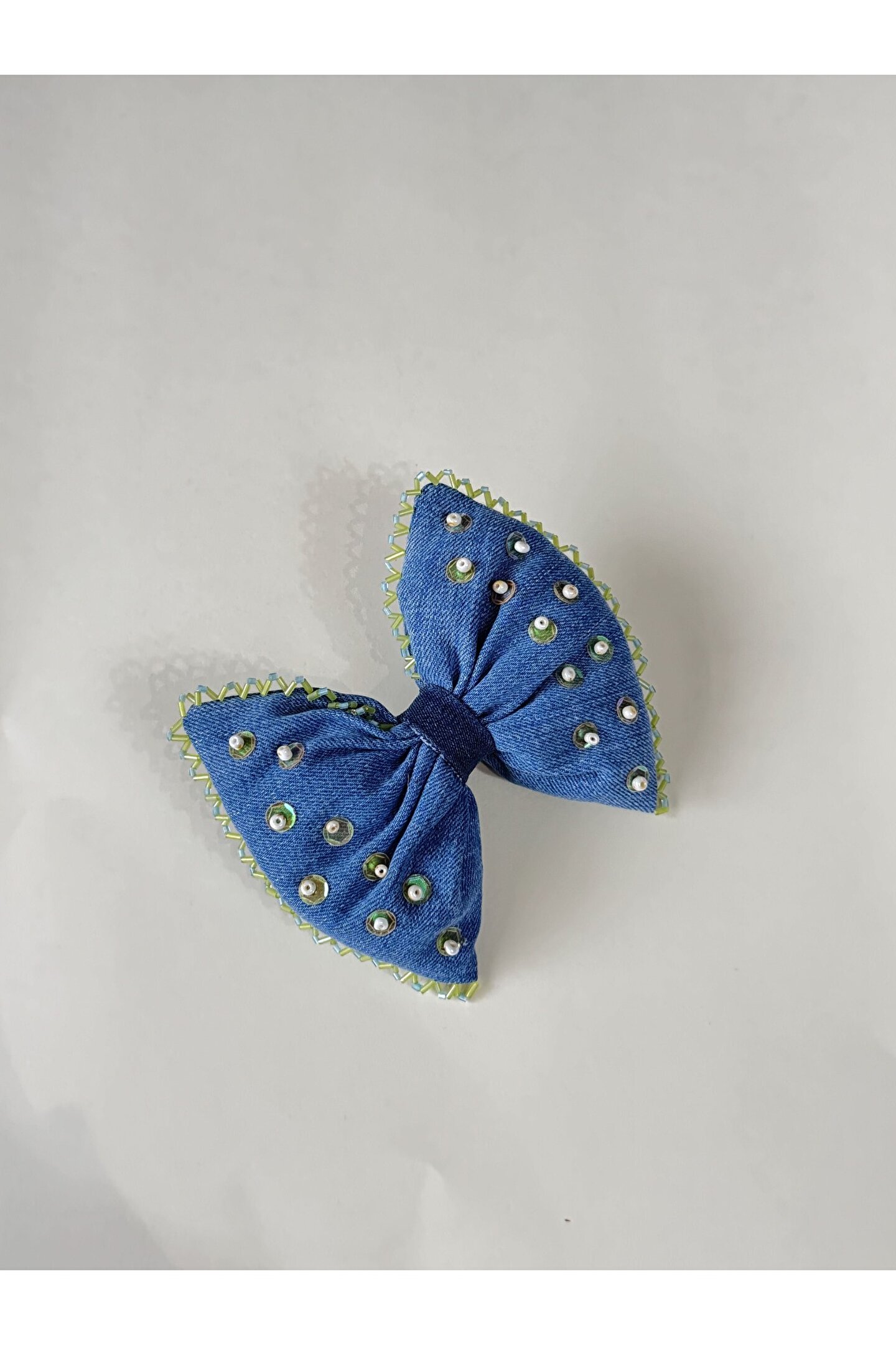 • Kumaş üzerine cam ve kum boncuk işlemeli özel tasarım otomatik fiyonk toka.