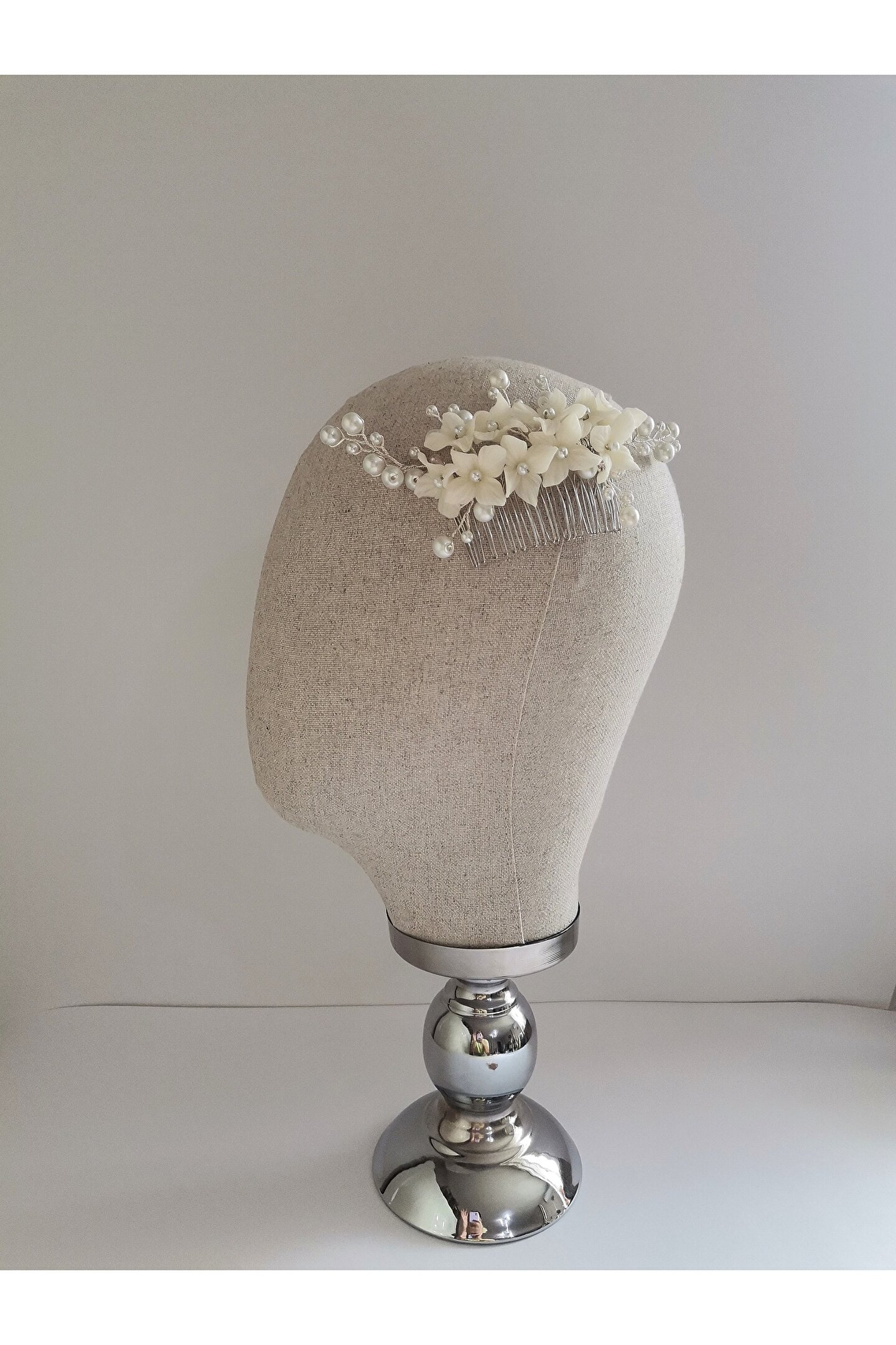 • Çiçek taneleri ve inci boncuklar ile hazırlanmış özel tasarım saç tarağı ve küpe seti.