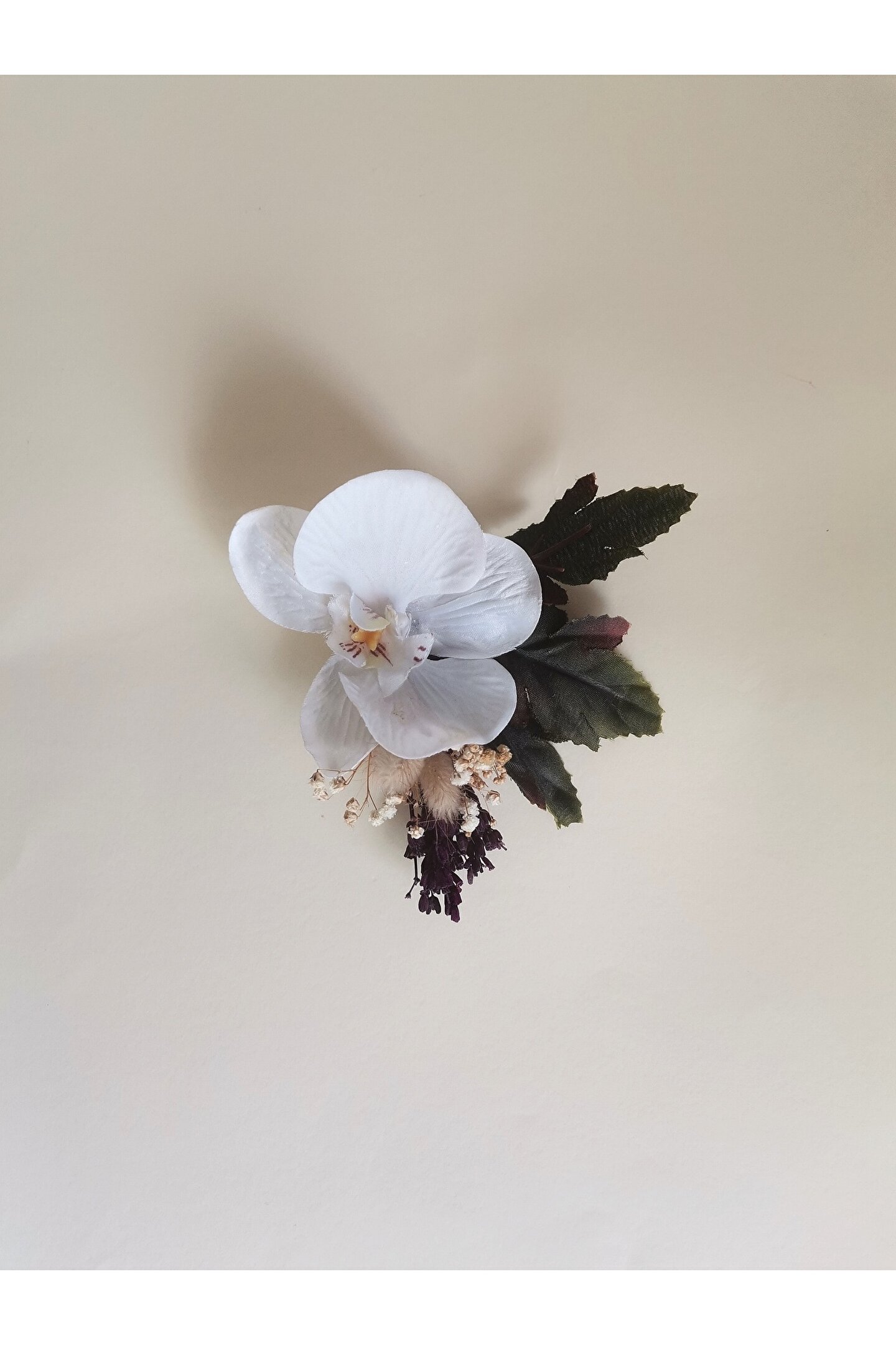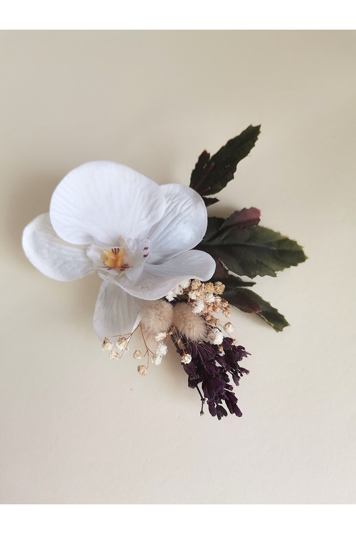 • İthal malzemeler ile hazırlanan özel tasarım damat yaka çiçeği. Beyaz-yeşil-mor