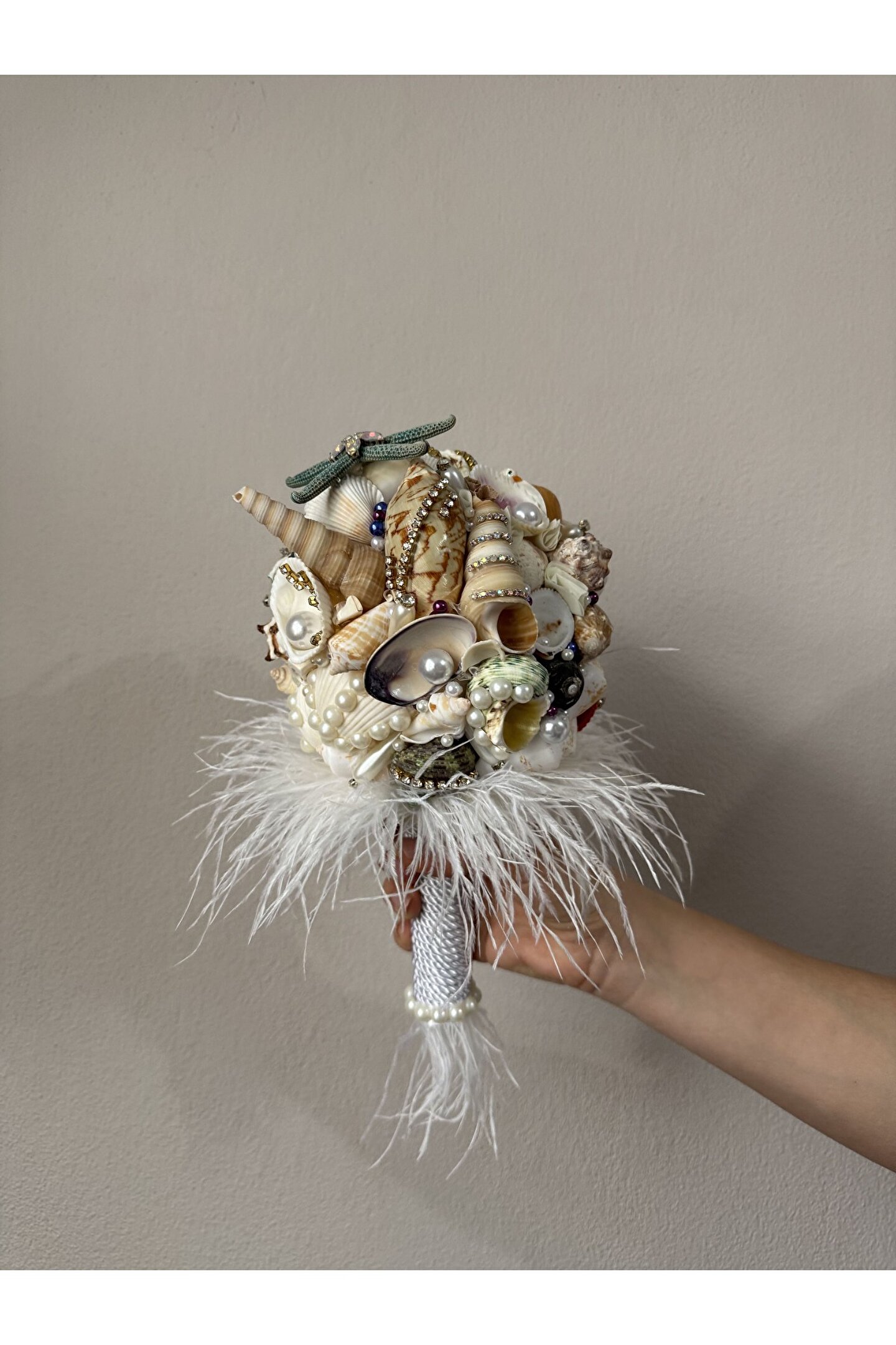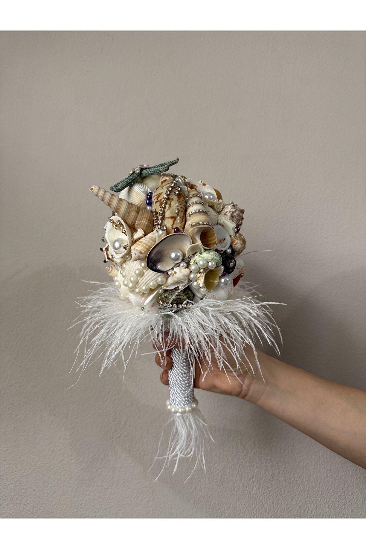 Sıradan çiçek buketlerinin ötesine geçen bu özel tasarım, Bivalvia Accessories imzası taşıyan bir ikon parça. Tamamen el yapımı olan bu gelin buketi; deniz kabukları, doğal taşlar, inciler ve zarif boncuklarla tek tek işlenerek hazırlandı. Her detayında denizin ruhunu ve zarafetini taşıyan bu buket, sadece bir adet üretildi.