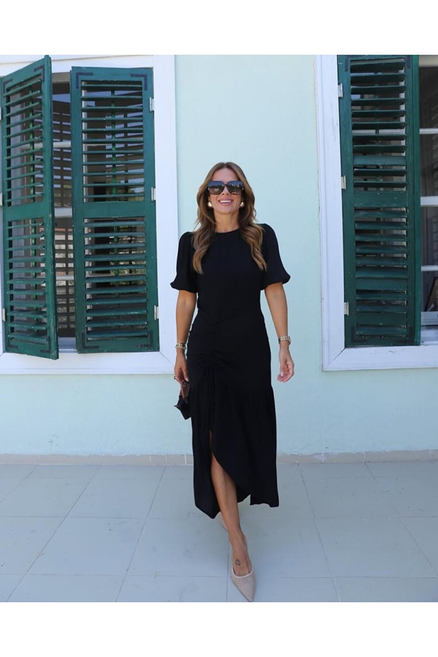 Bizcomoda EQURİ Kadın Kısa Kollu Bisiklet Yakalı Yandan Yırtmaçlı Büzgülü Janjan Krep Elbise