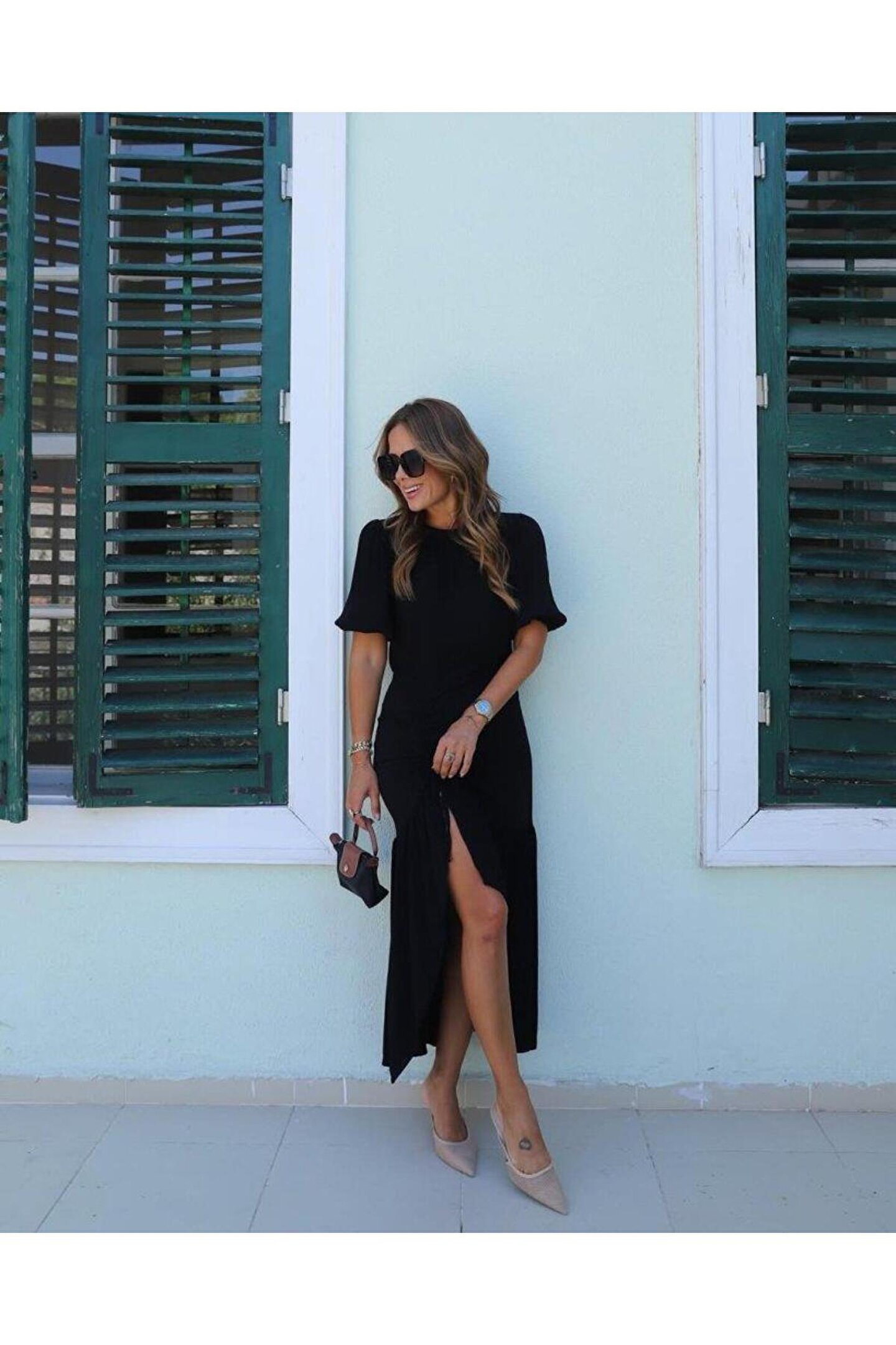Kadın Kısa Kollu Bisiklet Yakalı Yandan Yırtmaçlı Büzgülü Janjan Krep Elbise