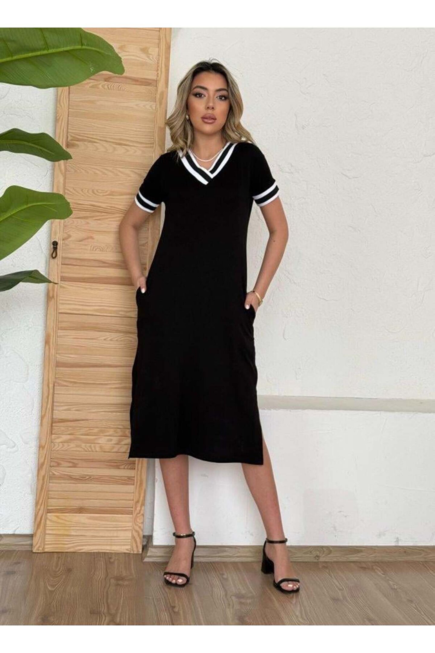 Kadın Kısa Kollu V Yaka Kol Ve Yaka Ribana Detay Midi Boy Viskon Elbise