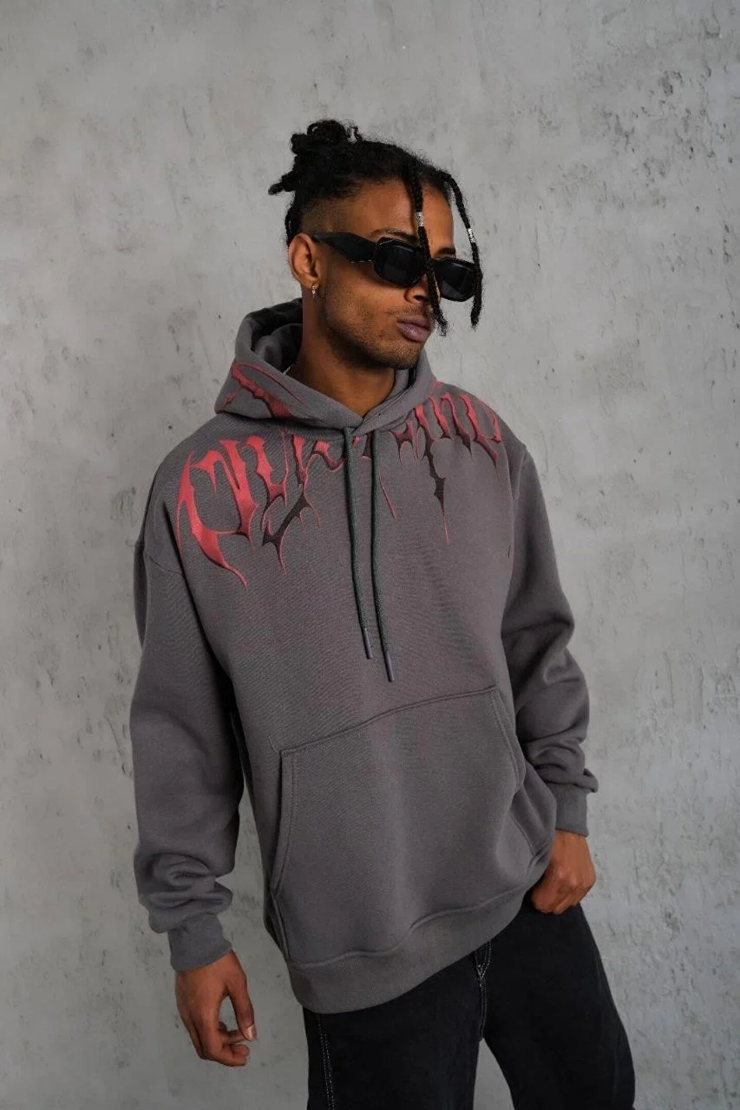 BLACK MODBLACK Erkek Ön Ve Arka Baskılı Kapüşonlu 3 İplik Sweatshirt - Füme