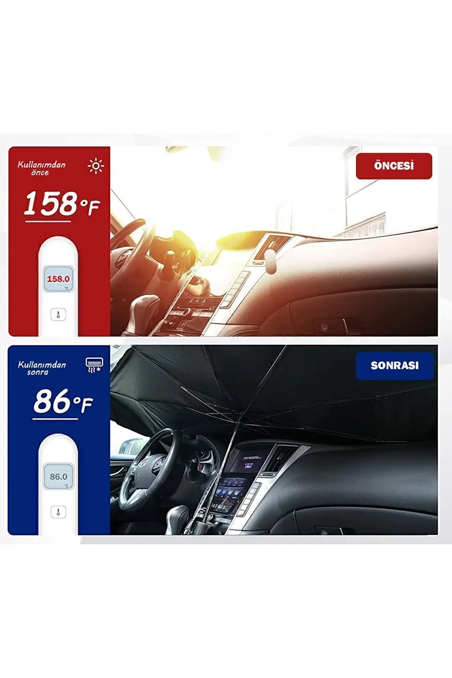 R: Araba Güneş Koruyucu Şemsiye Oto Ön Cam Güneşlik Aracınızı güneşin zararlı etkilerinden korumak ve aşırı ısınmayı engellemek için koruyucu şemsiye ideal bir seçim olacaktır.; Şemsiye tasarımıyla saniyeler içinde pratik bir şekilde açıp kullanabilirsiniz.; Kapalı haliyle sadece aracınızda bir şemsiye kadar yer kaplar.; Güneşi engelleyerek araç iç yüzeylerinin yıpranmasına engel olur.; Aracınıza bindiğinizde çok daha serin bir ortam sizi bekler.; Koltuğunuza rahatlıkla otura bilir, direksiyonunuzu rahatlıkla tuta bilirsiniz.; Aracın iç sıcaklığını 70 °C ye kadar düşürebilir.; Sedan, SUV, Hatchback araçlar ile uyumludur.; Boyutlar: 140m*79cm .