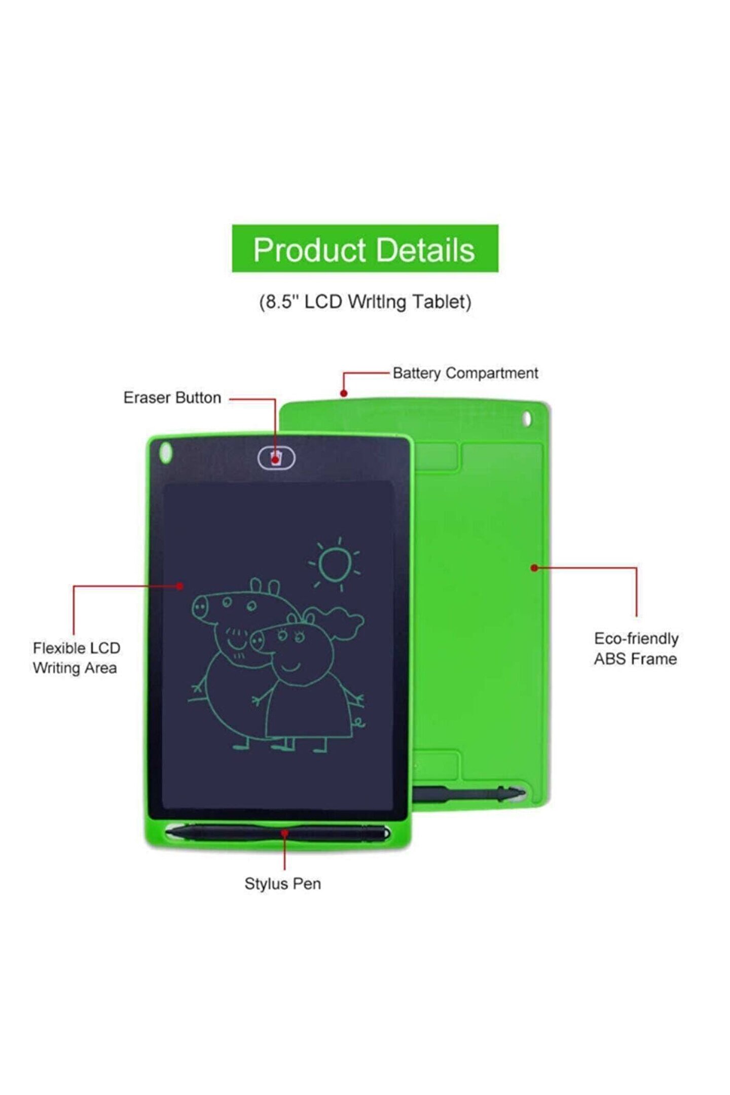 8; 5 inç büyüklüğünde hem not tutmak hem resim çizmek gibi farklı fonksiyonları barındırır; Taşınabilir hafiflikte ve boyuttadır; Dokunmatik kalemi ile birlikte rahat kullanım sağlar; Hafif renk, gözlerinize zarar vermez, radyasyon yoktur; Basınca duyarlı, kullanımı kolaydır; Ekranı sadece bir düğme ile temizleyin; Arkasındaki kilit tuşu ile silmeyi tamamen durdurabilirsiniz; Pilini çıkarıp rahatça değiştirebilirisiniz; Ultra ince ve hafif tasarım, taşımak için uygun; Yazma ve çizim, ev mesajı vb; Için uygundur; Lcd grafik not yazma ve çizim tabletibas sil; Çizim yaptıktan ve yazı yazdıktan sonra tek tuş ile silebilirsiniz; 8; 5 inç'lik lcd çizim ekranı; Ergonamik dizayn sayesinde ve ince tasarımlı lcd ekranı sayesinde kullanımı çok kolay ve pratiktir; Çok hafif olması sayesinde istediğiniz yere taşıyabilir ve istediğiniz yerde kullanabilirsiniz; ;;
