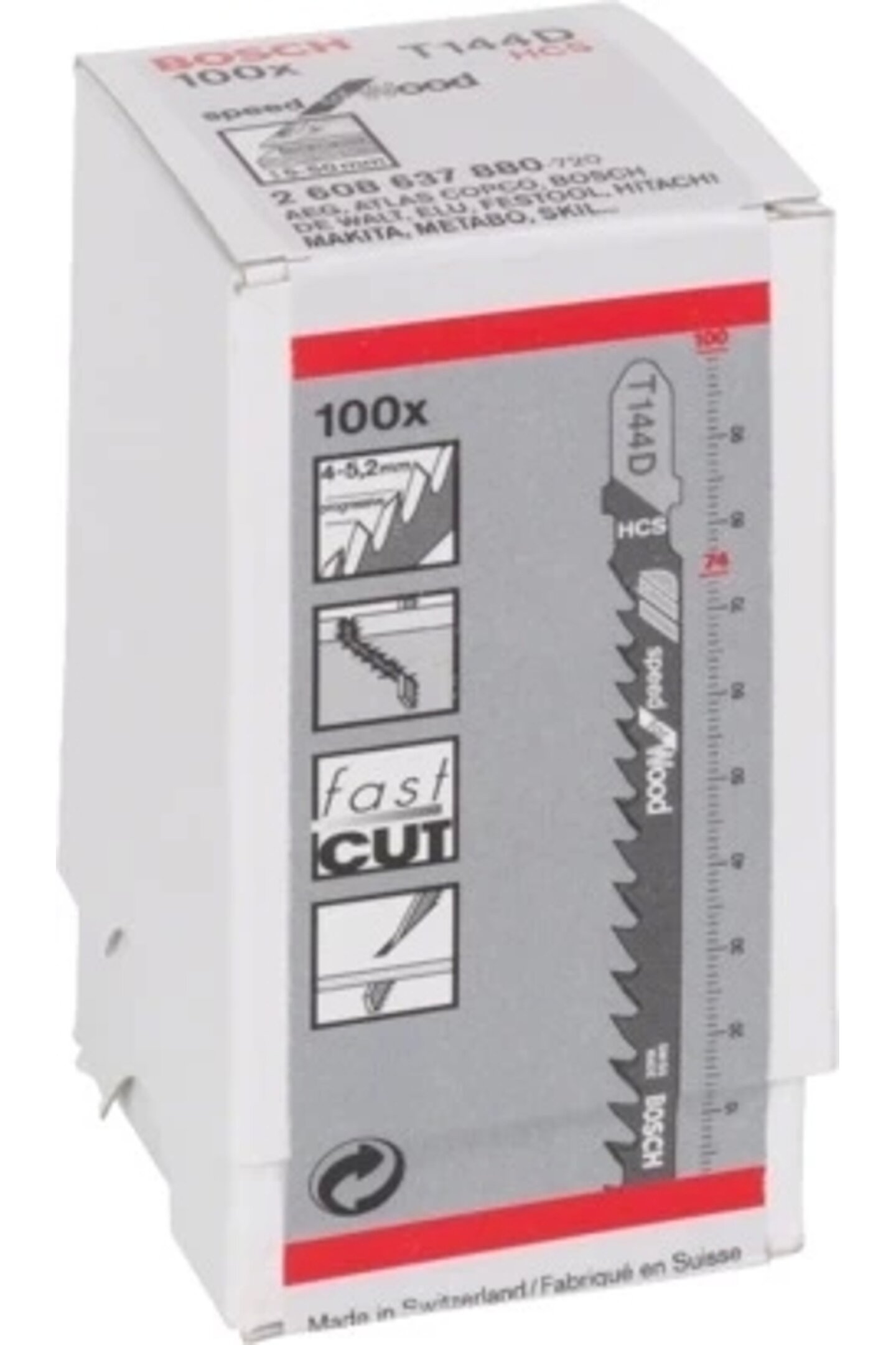 T 144 D Speed for Wood Dekupaj Testeresi Bıçağı, ahşap üzerinde hızlı düz kesimler yapar Taşlanmış yandan setli keskin dişler, hızlı sonuçların alınmasına olanak sağlar Yüksek karbonlu çelik bıçak, yumuşak ahşap ve aşındırıcı olmayan ağaç işçiliği malzemelerindeki kesimler için uygundur Tüm T; şaft dekupaj testerelerine uyar Ambalaj türü: Kağıt / Karton / Oluklu karton – Paket, tüp, askı deliği ile Paket adedi: 100 Adet Malzeme: HCS Diş tipi: daraltılmış, taşlanmış Toplam uzunluk: 100 mm Diş dağılımı: 4; 0; 5; 2 mm Kullanım alanları: Yumuşak ahşap (5; 50 mm), sunta, marangoz plakaları, elyaflı plakalar Önerilen min; malzeme kalınlığı: 5 mm Önerilen maks; malzeme kalınlığı: 50 mm Tip: T 144 D;