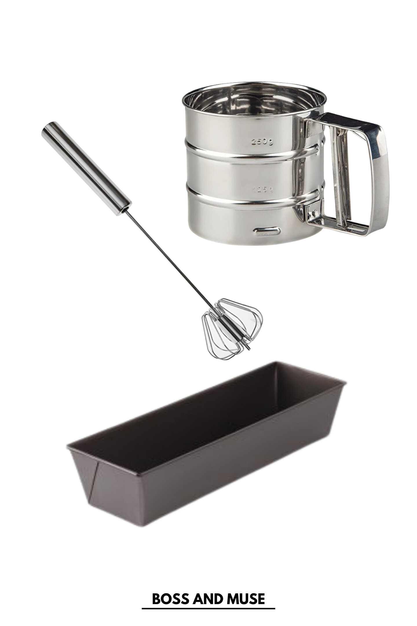 bossandmuse 3 Parça Baton Kek Kalıbı Pasta Yapma Seti Un Eleği Basmalı Çırpıcı