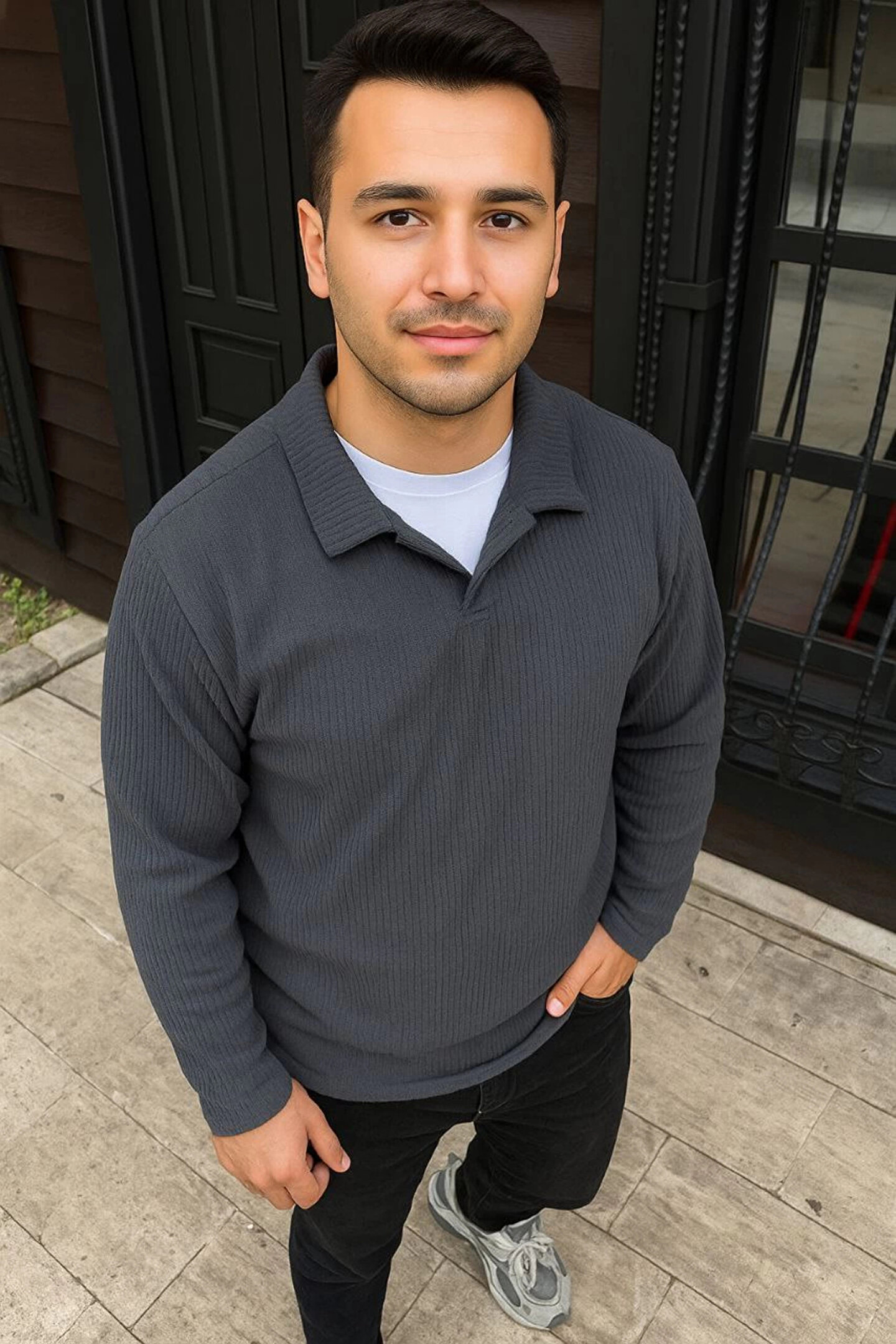 BÜŞRA TEZEL MODA Erkek Fitilli Polar Sweatshirt – Düğmesiz Polo Yaka, Oversize Rahat Kalıp, Kalın Polar Kumaş, Kışlık
