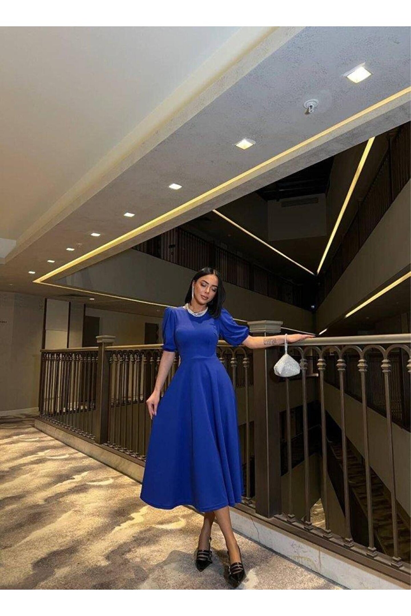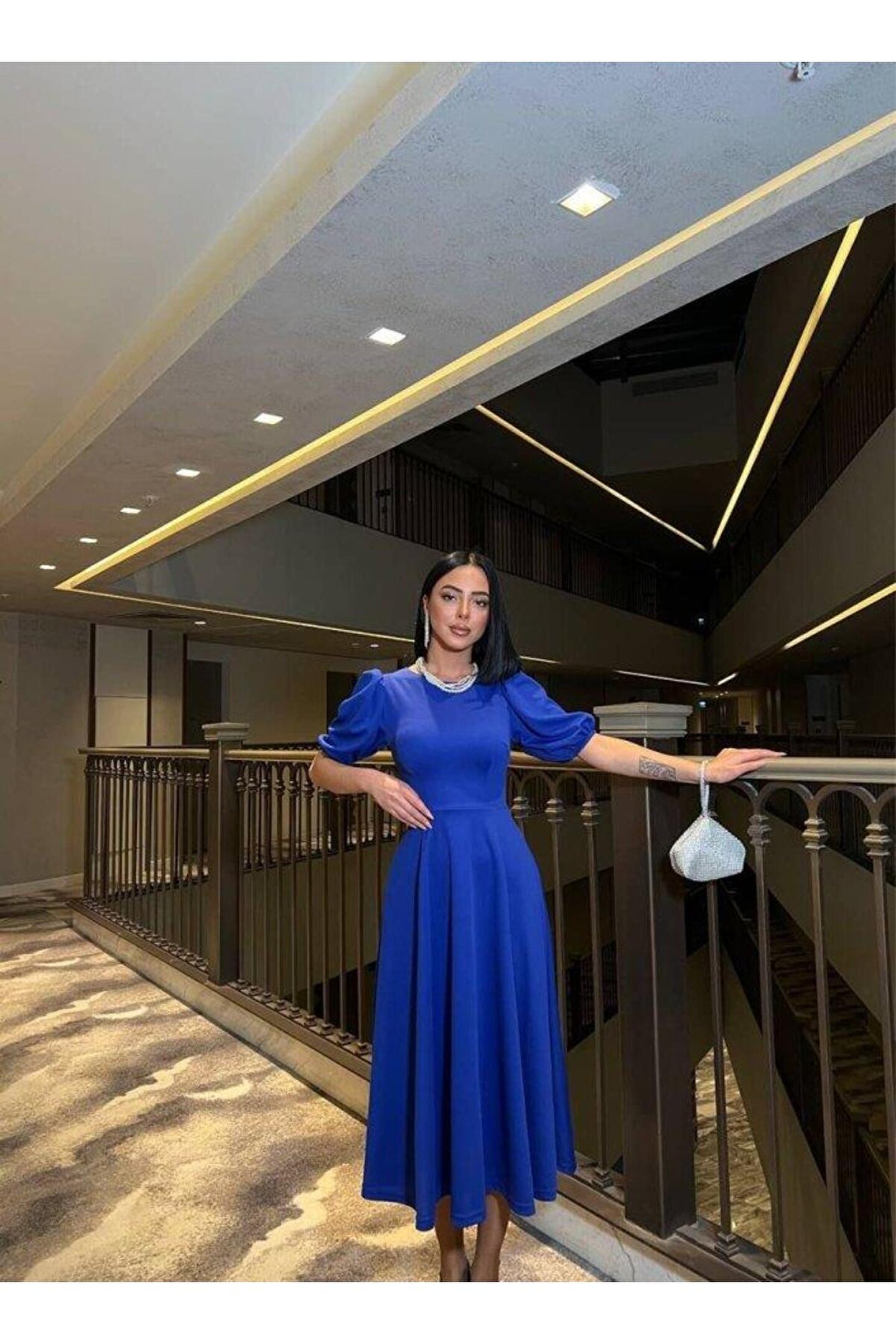 BÜŞRA TEZEL MODA Kadın Bisiklet Yaka Kısa Kol Lastik Detay Uzun Elbise