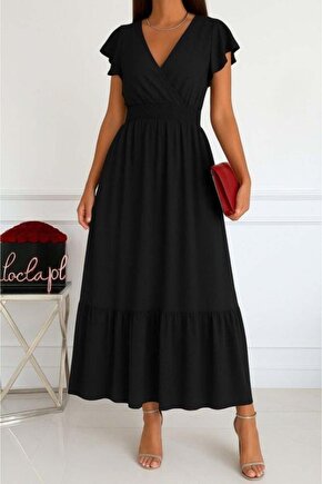 BÜŞRA TEZEL MODA Kadın Kısa Kelebek Kollu Kruvaze Yakalı Beli Lastikli Aerobin Elbise