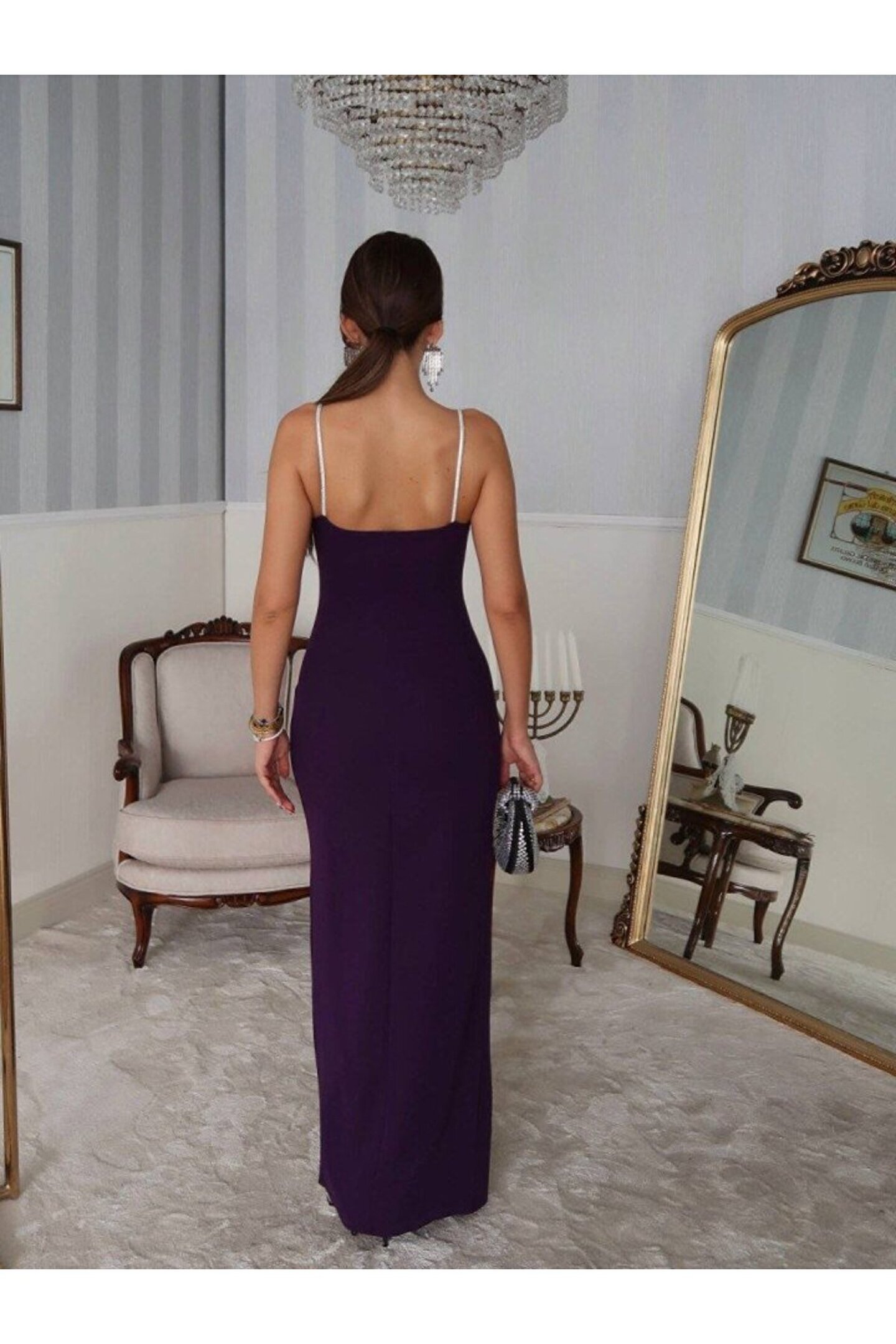 Kadın Omuz Askılı Derin Yırtmaç Detay Maxi Boy Elbise