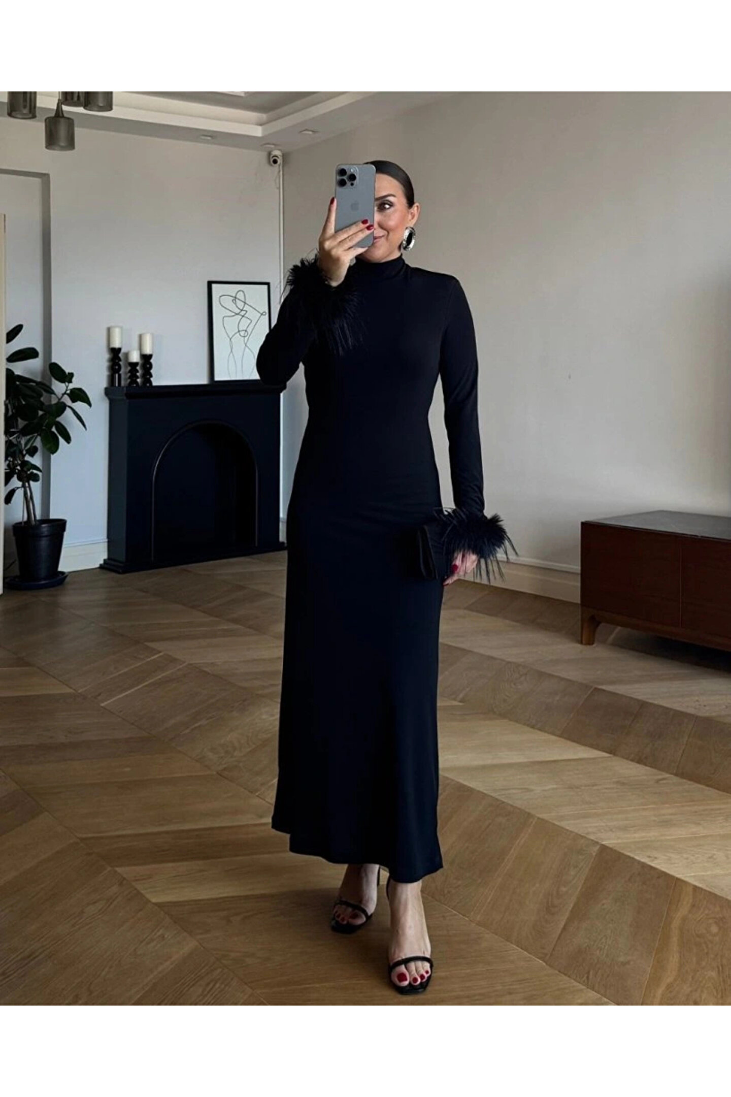 BÜŞRA TEZEL MODA Kadın Uzun Kollu Balıkçı Yaka Kol Ağzı Tüy Detaylı Uzun Krep Elbise