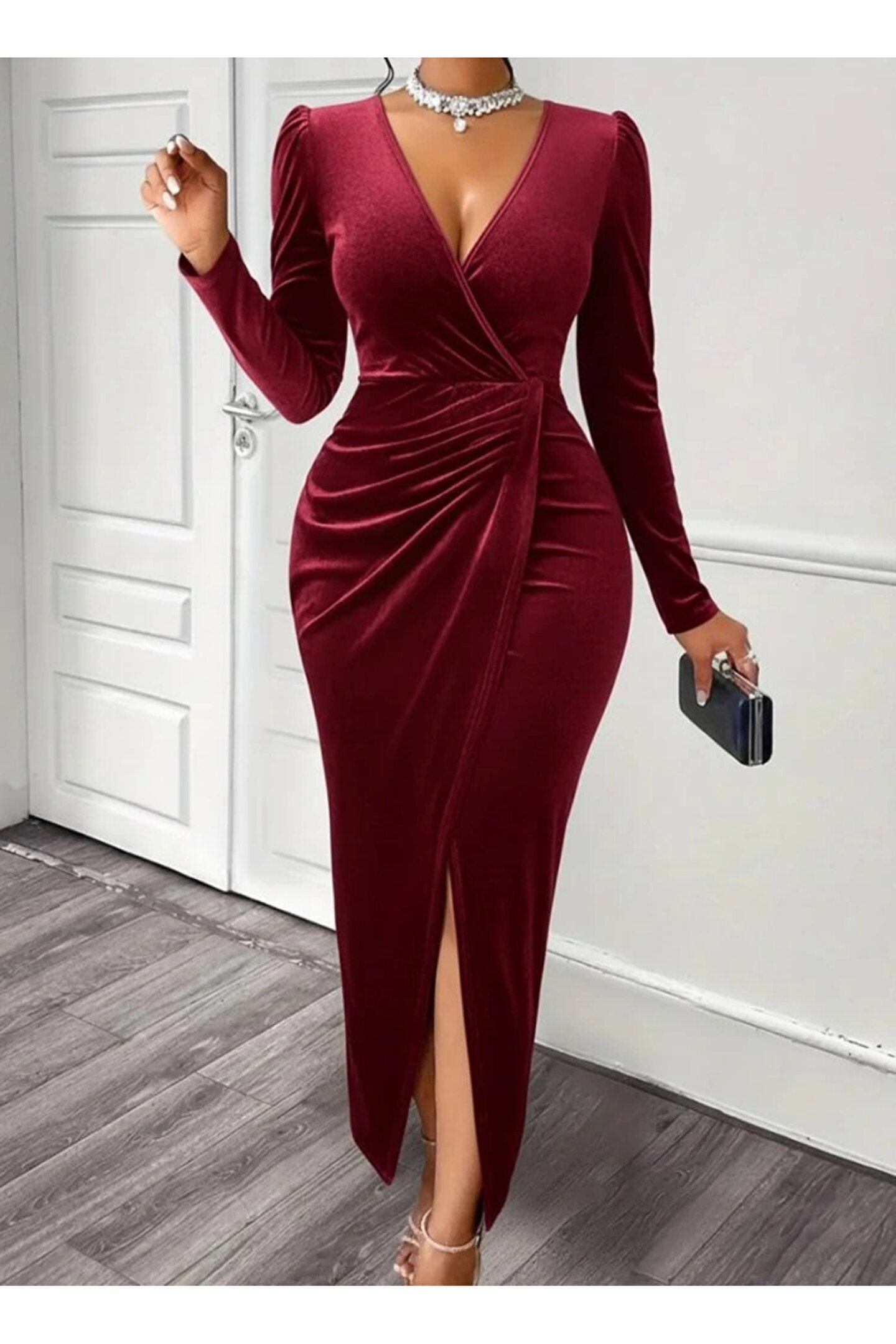 Kadın Uzun Kollu Kruvaze Yaka önünden çapraz Detaylı Uzun Kadife Elbise