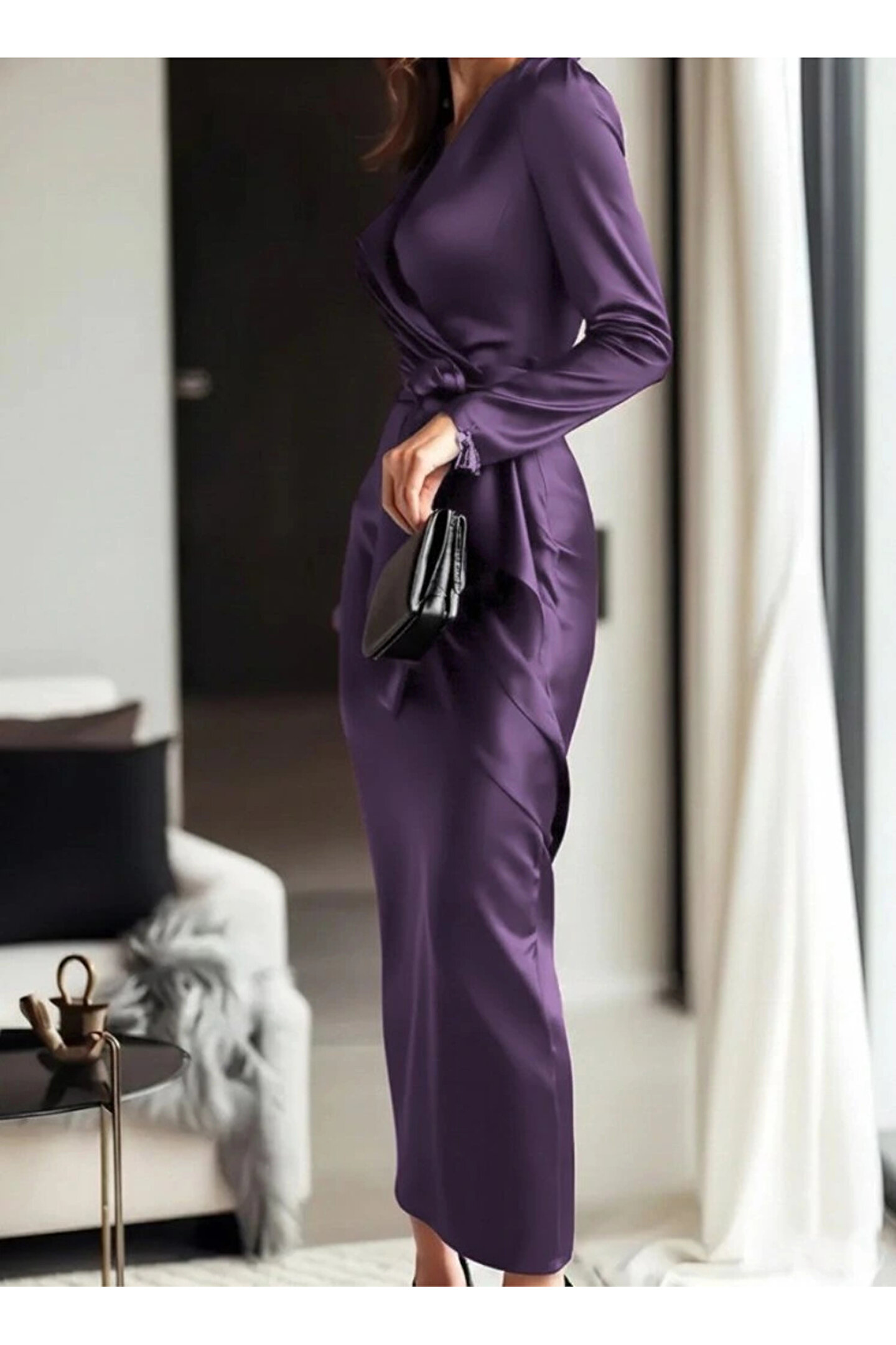 BÜŞRA TEZEL MODA Kadın Uzun Kollu Kruvaze Yakalı Beli Kuşaklı Uzun Saten Elbise