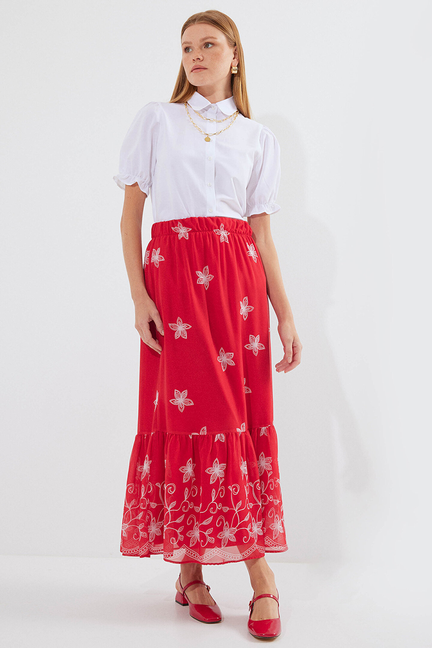 Butik 8010 Desenli Şifon Etek - A.Kırmızı