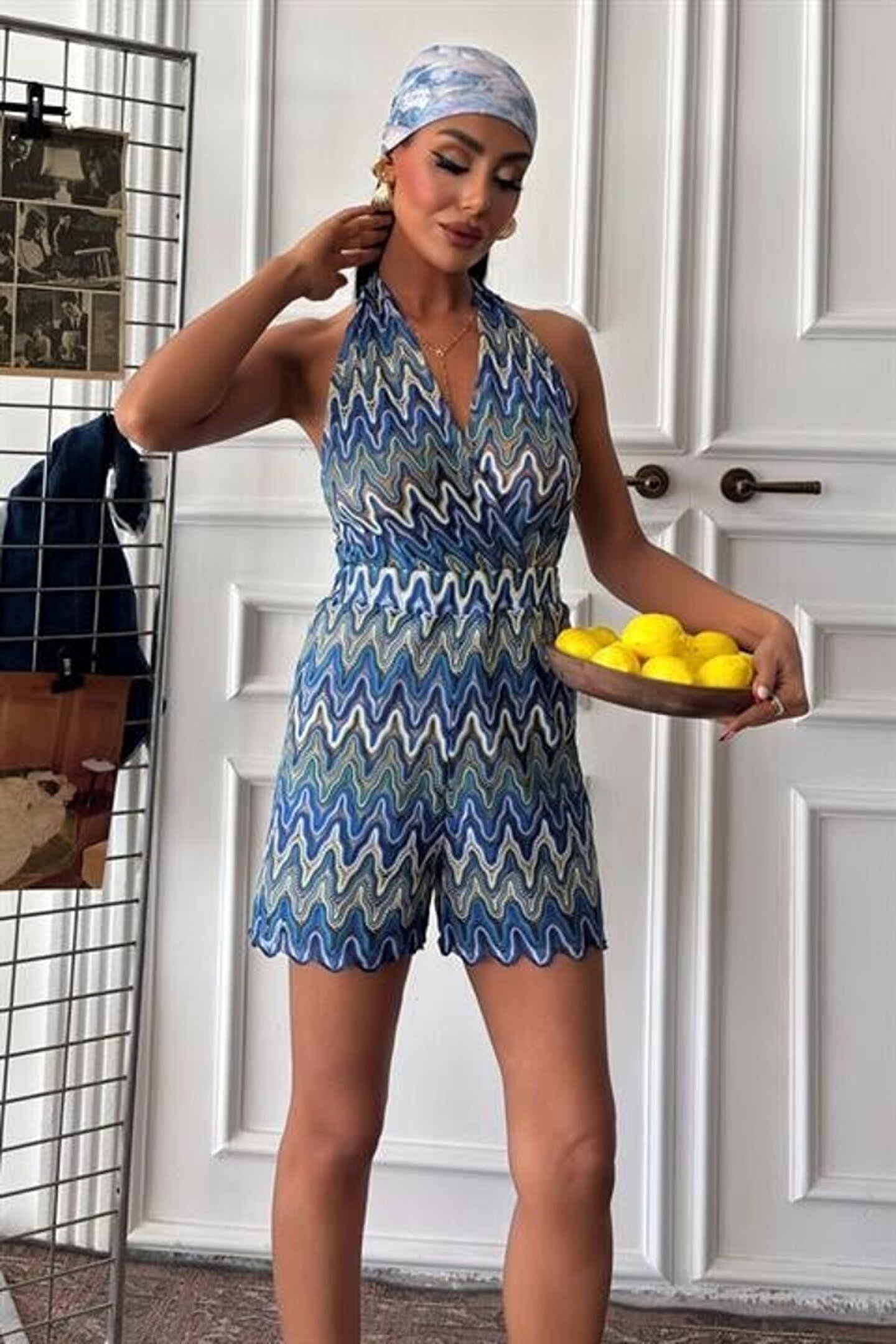 Butik Aura Mou Gökyüzü Moda Zikzak Desenli Multi Renk Geçişli Mini Tulum 1365